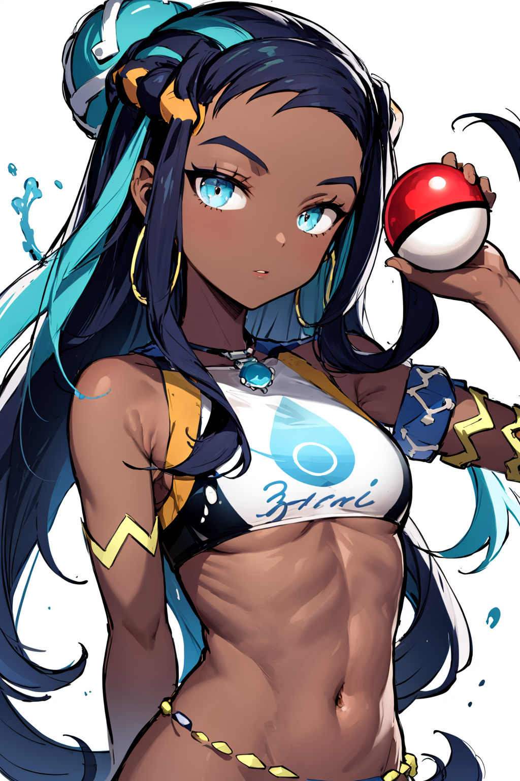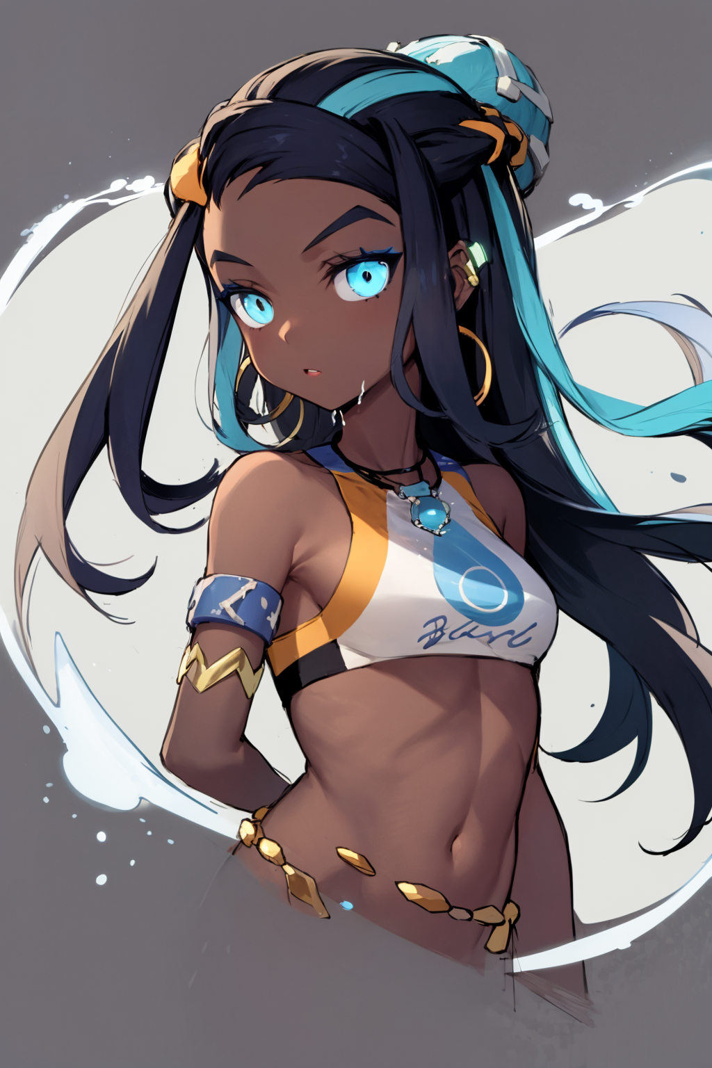 Basic prompts : black hair, blue hair, long hair, multicolored hair, blue eyes, dark skin, single hair bun