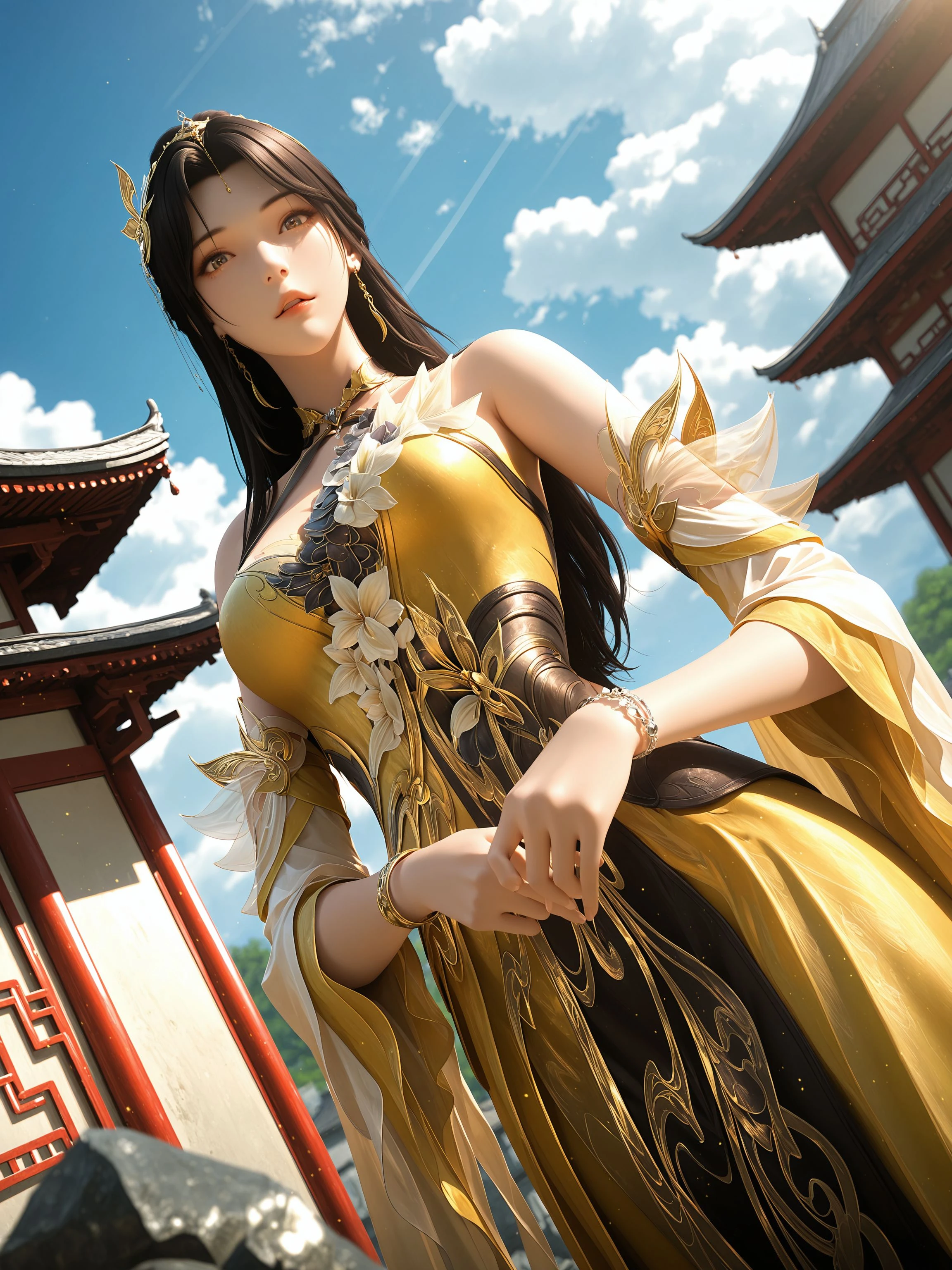 1girl, dress, yellow dress, jewelry, solo, long hair, earrings, hair ornament, detached sleeves, bracelet, ???? shoulders