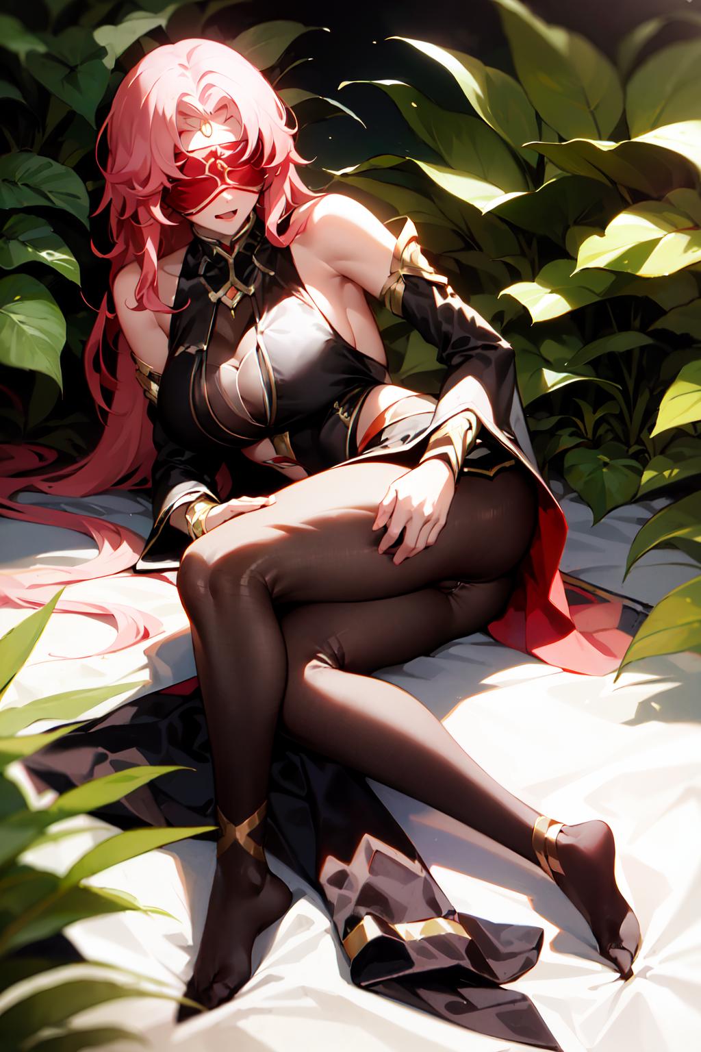 Recommended tags - Babel, 1girl, solo, , , pink hair, earrings, lipstick, hood, hood up, blindfold, gem, shoulders, detached sleeves, elbow gloves,