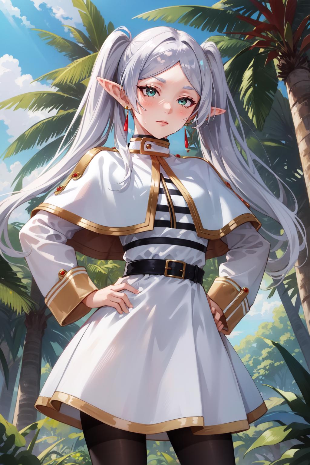 pointy ears, jewelry, earrings, twintails, long sleeves, capelet, white capelet, dress, parted bangs, white dress, belt, pantyhose