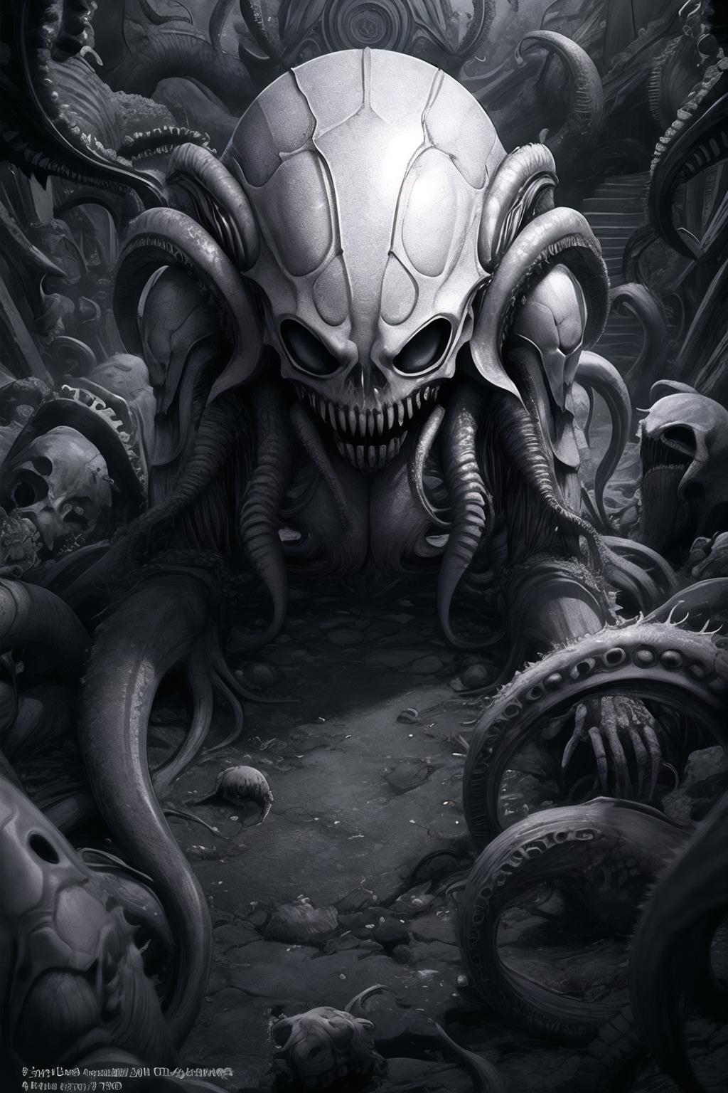 Alien and monster and octopus and crusu relief wall in the style of H.R.Giger.