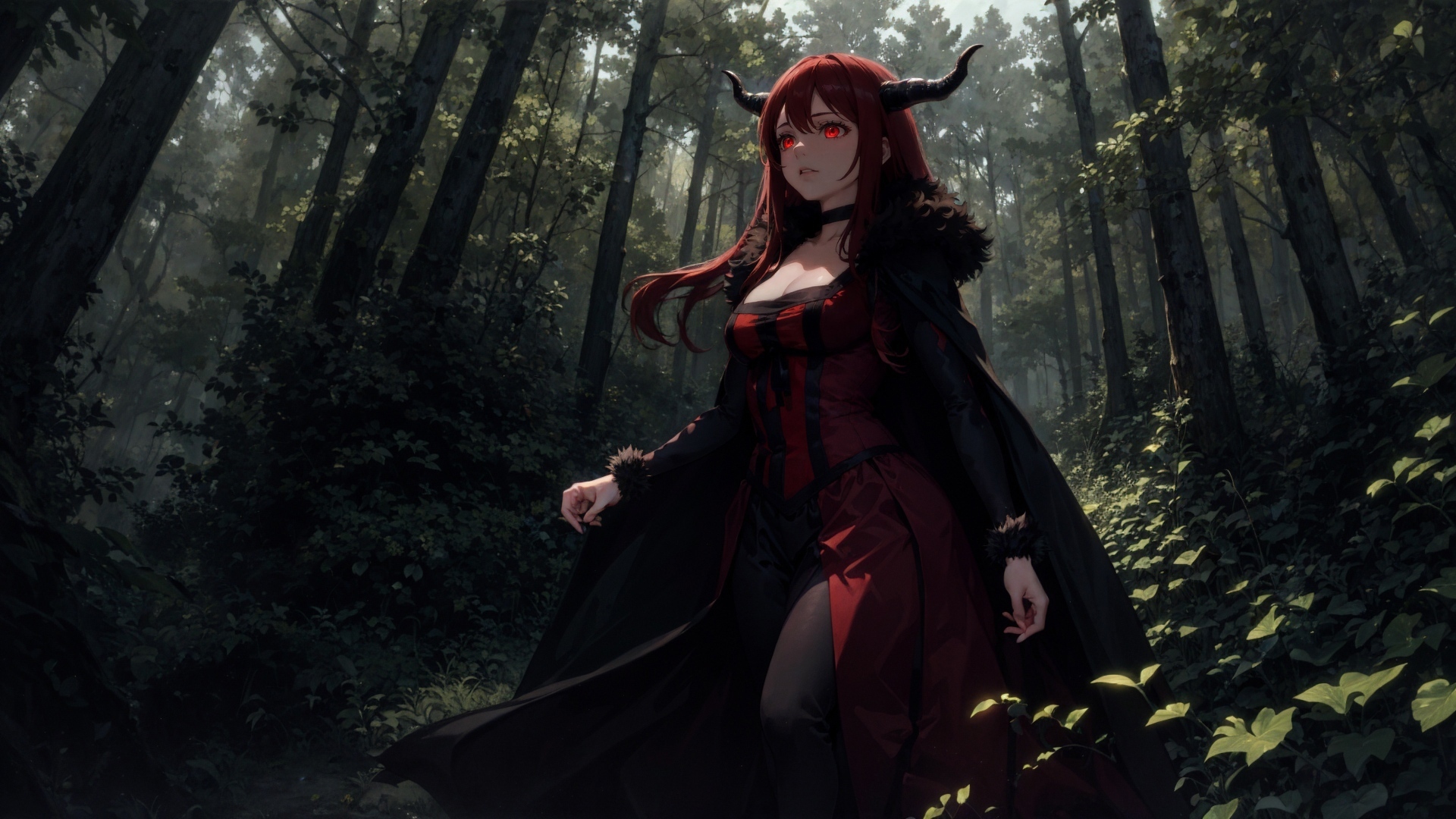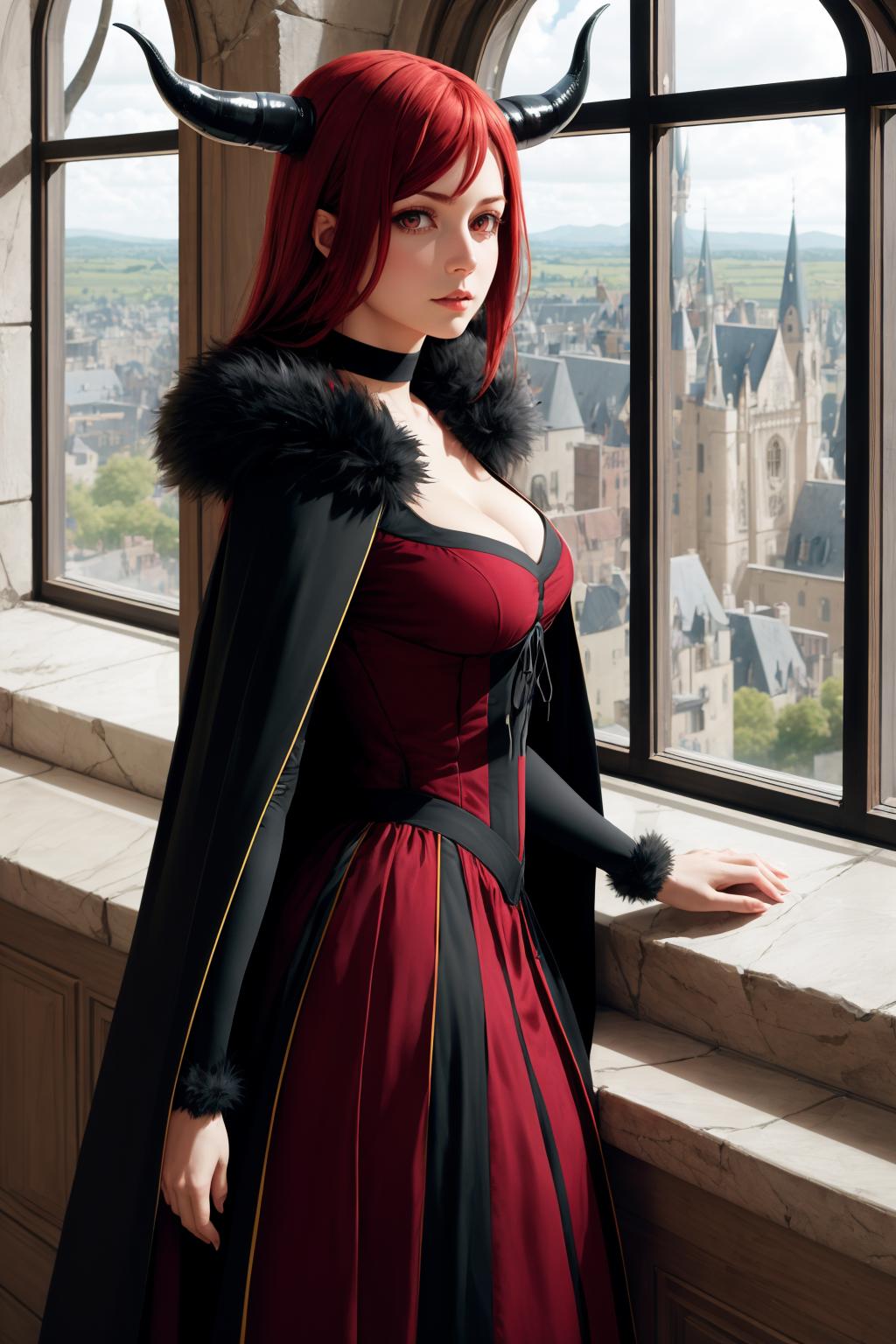 Add "horns, choker, fur trim, black cape, long red dress" for her typical look.
