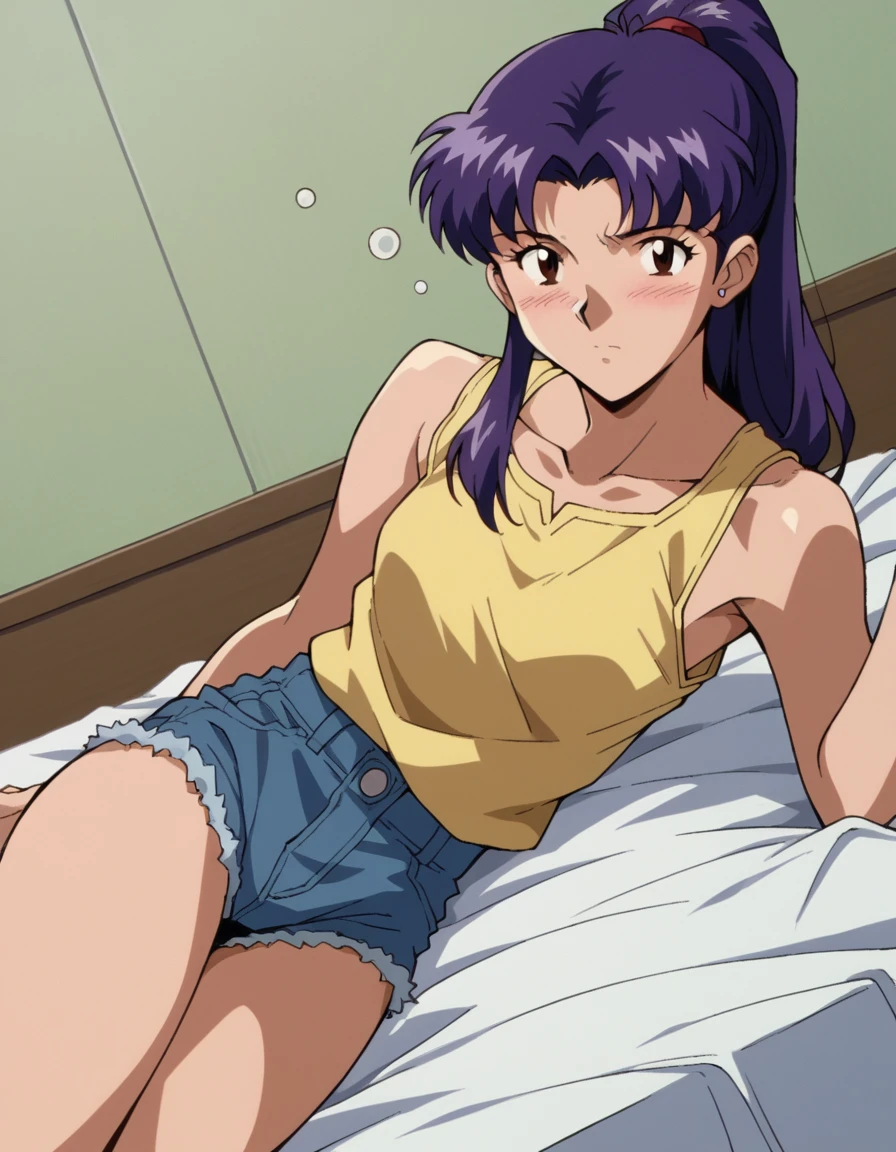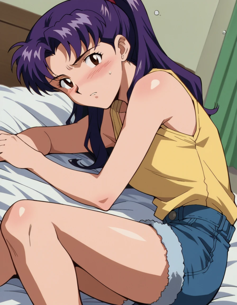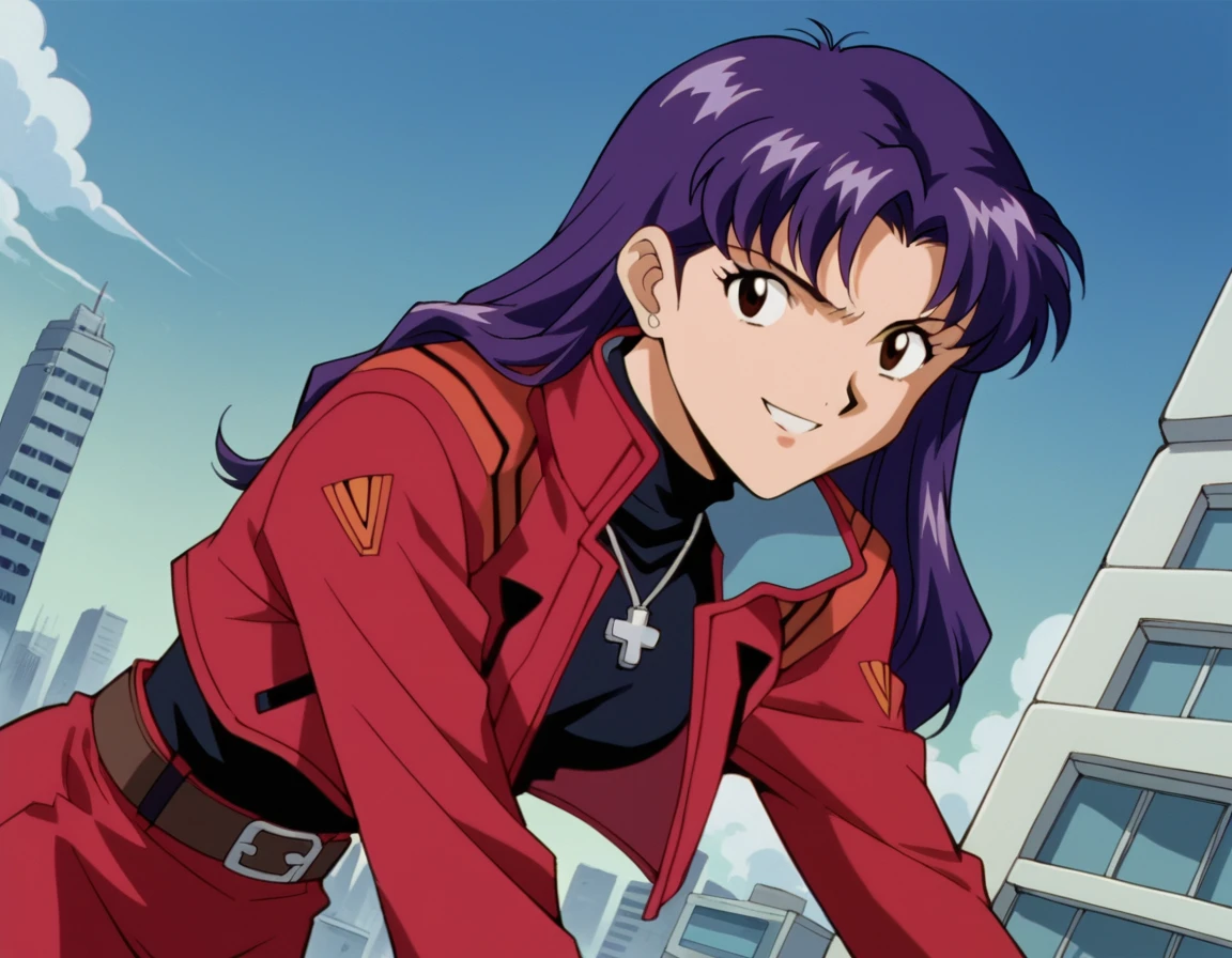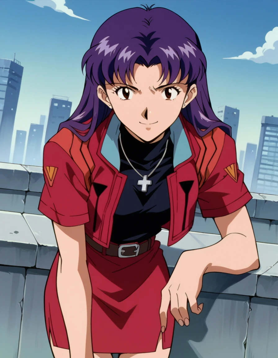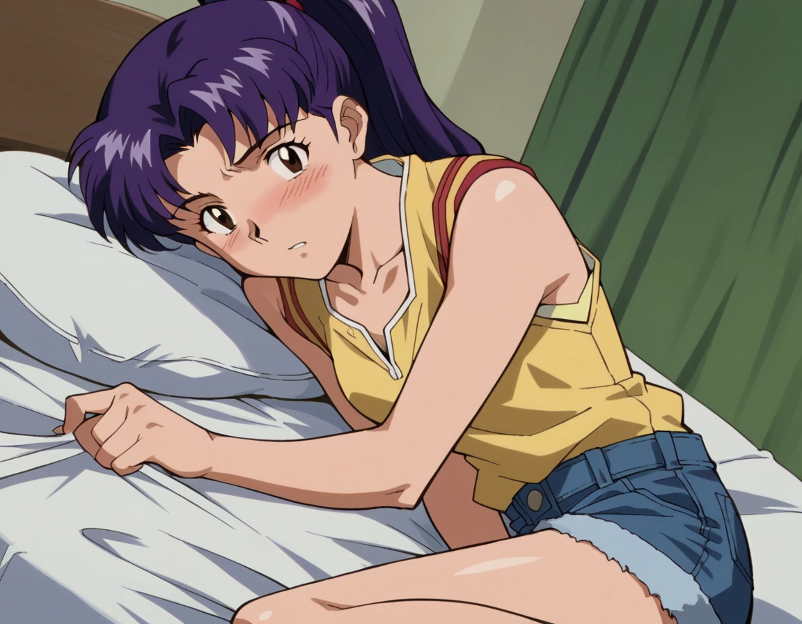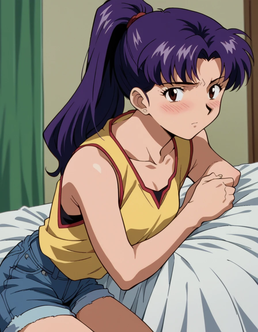 misato katsuragi, long hair, brown eyes, purple hair, parted bangs, ponytail, sidelocks,