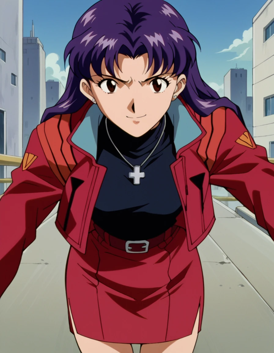 misato katsuragi, long hair, brown eyes, purple hair, parted bangs,