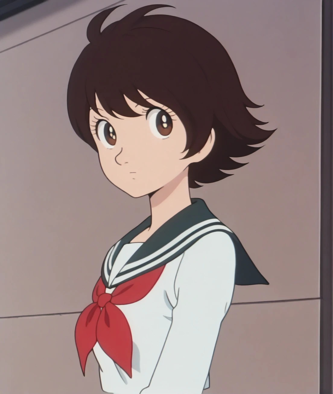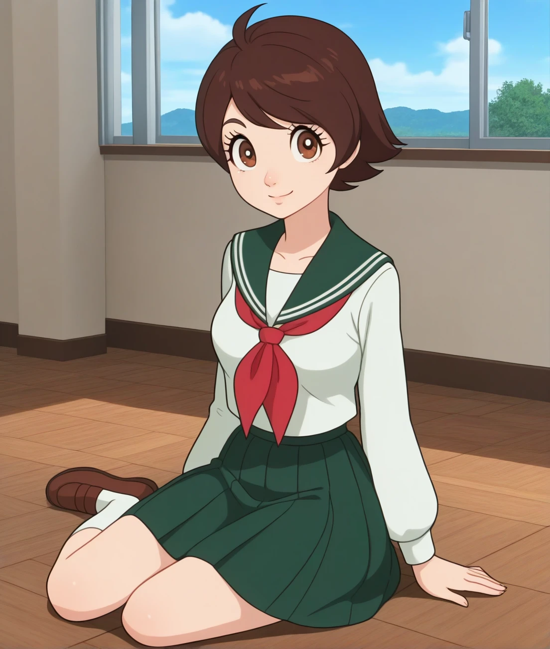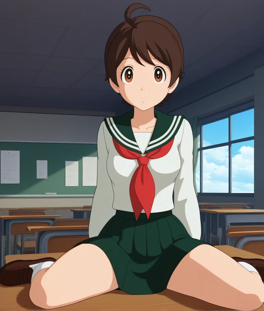 wato, 1girl, short hair, swept bangs, brown hair, brown eyes, nose, nape, (ahoge:0.5), big eyes, thick eyelashes, medium breasts, white serafuku, green collar, green skirt,
