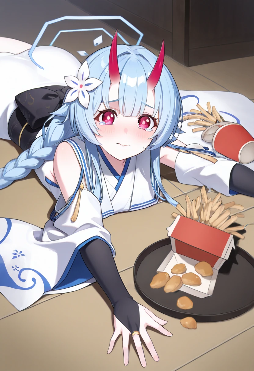 zzChise, red eyes, blue hair, long hair, side ponytail, horns, halo, hair flower, kimono, detached sleeves, wide sleeves, obi, white sailor collar, twin braids, bridal gauntlets,
