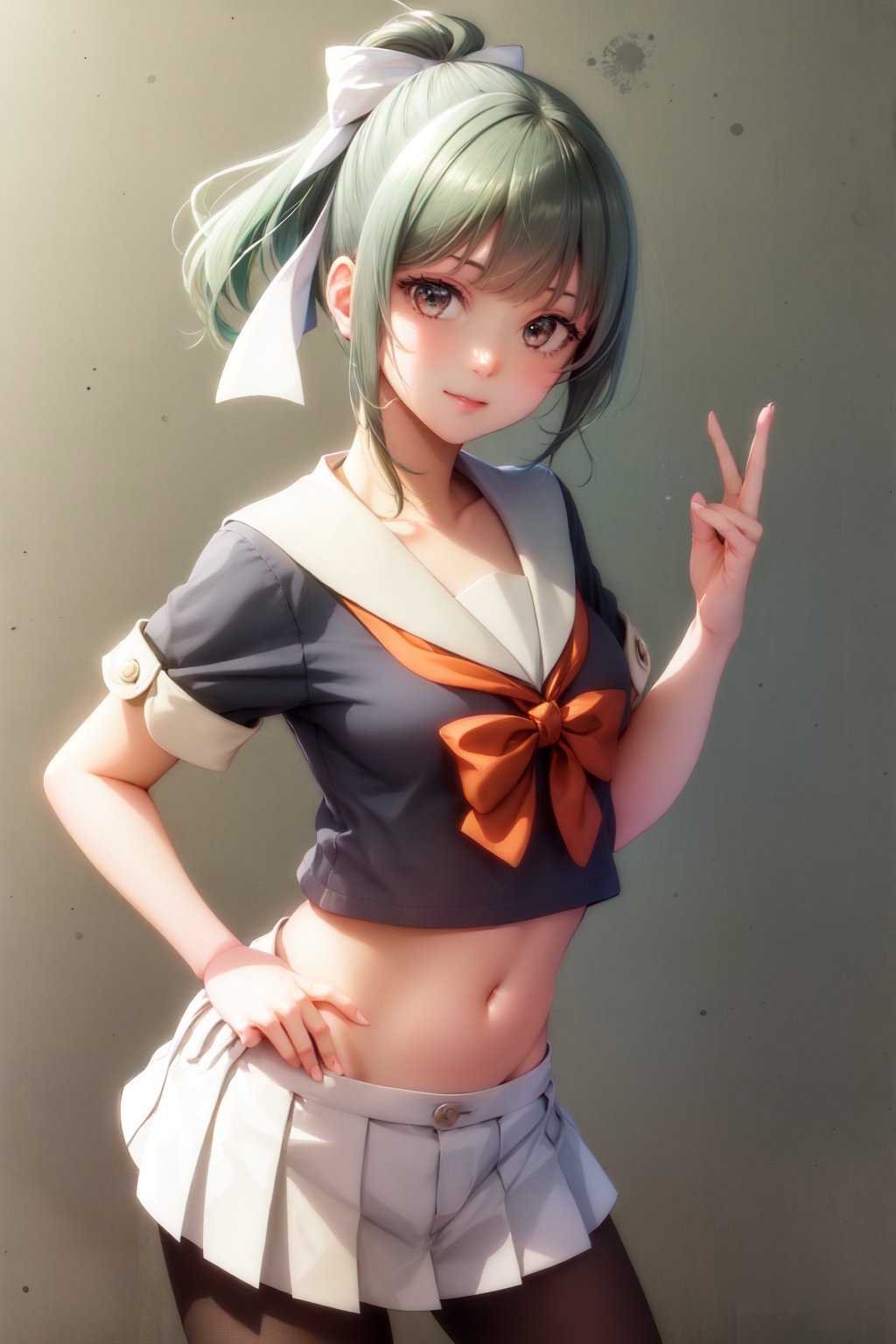 Default Outfit: yuubari, ponytail, hair bow, school uniform, serafuku, bowtie, short sleeves, pleated skirt, pantyhose, midriff