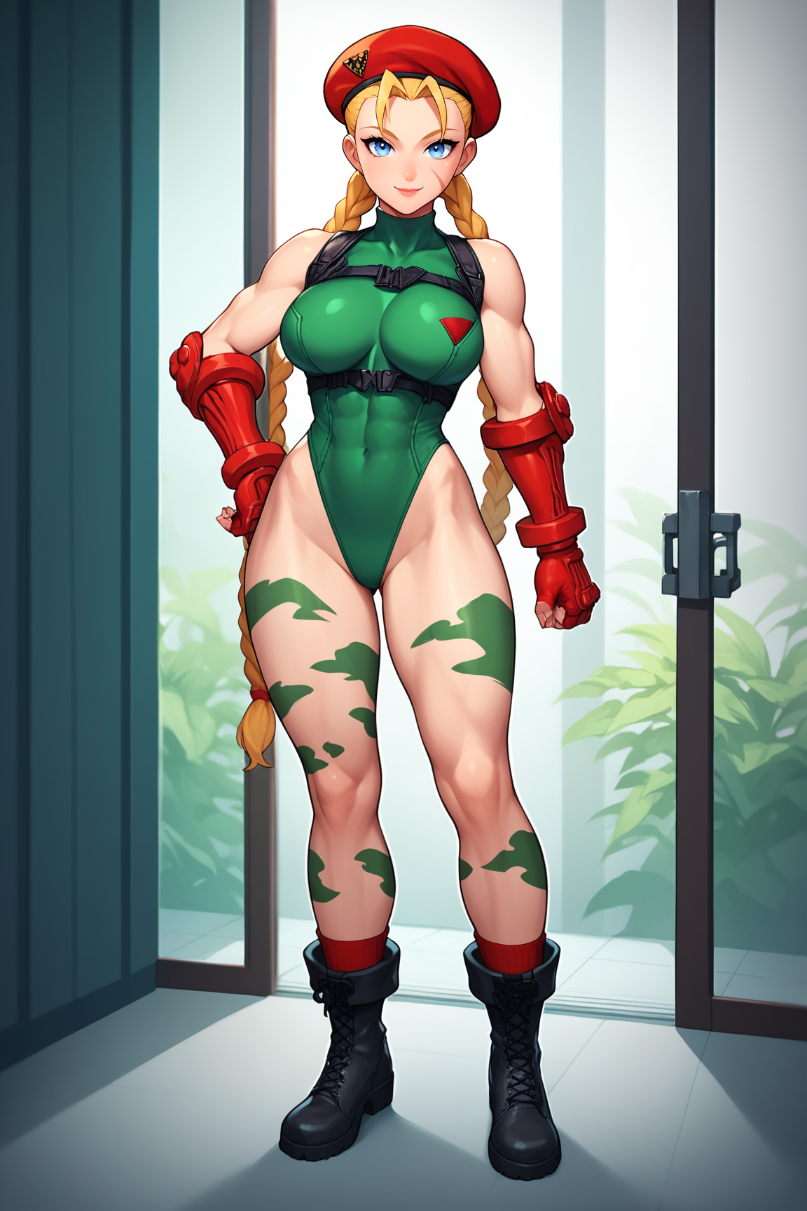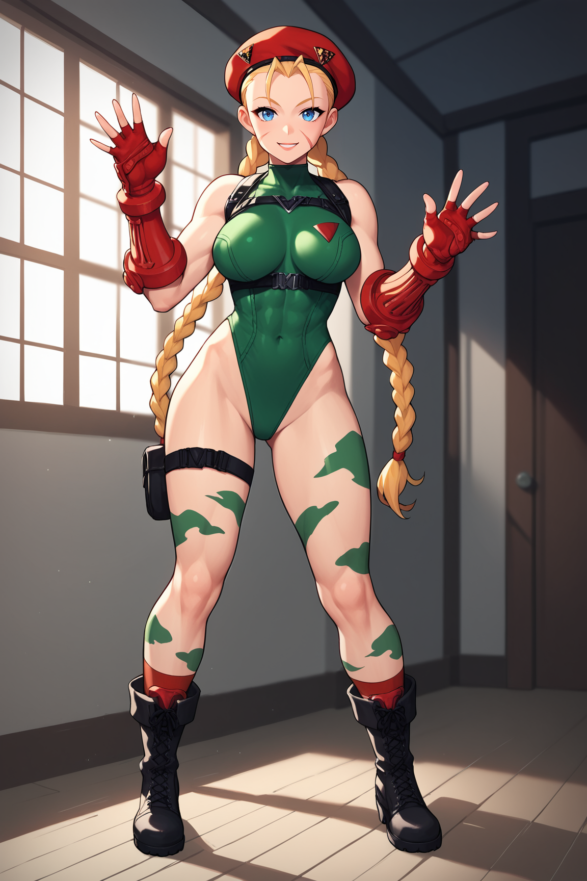 CammyWhiteSFXL, scar on cheek, blue eyes, blonde hair, long hair, twin braids, antenna hair, camouflage, red beret, large breasts, bare shoulders, green leotard, black harness, red gloves, fingerless gloves, black boots