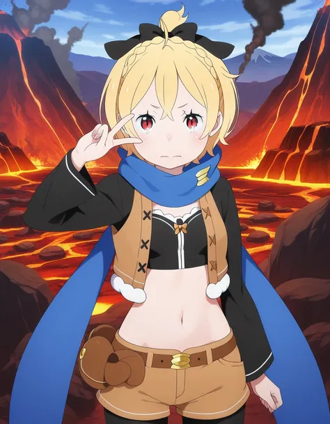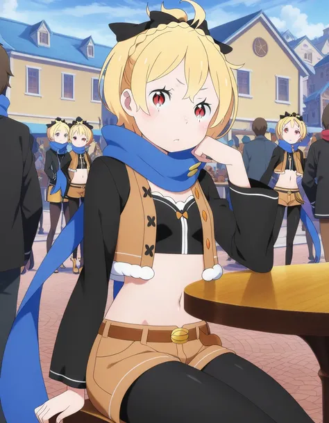 felt, felt (re:zero), blonde hair, red eyes, bow, ribbon, hair ribbon, braid, ahoge, hair bow, black ribbon, black bow, short hair, mature female, small breasts, anime screencap