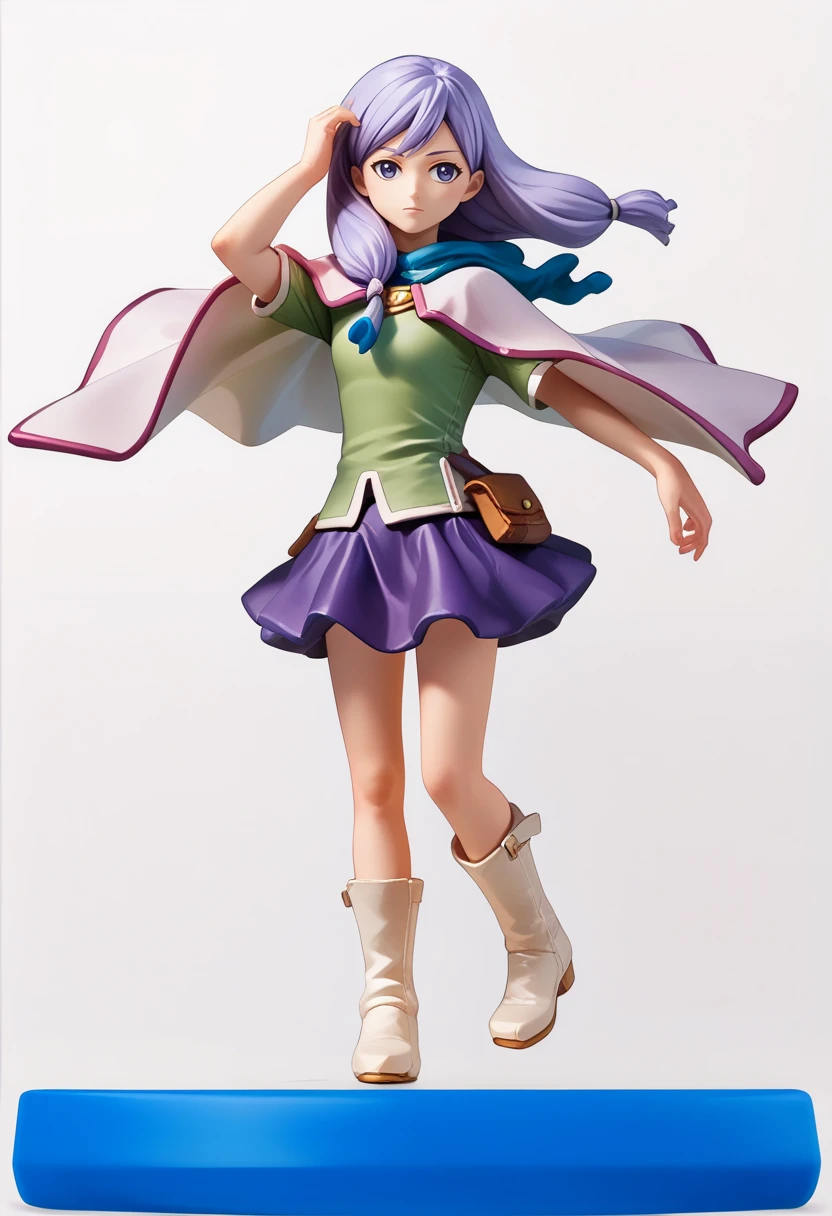 ilyanaPoR, lavender hair, bangs, lavender eyes, circlet, purple skirt, green shirt, short sleeves, pink capelet, white footwear, knee boots
