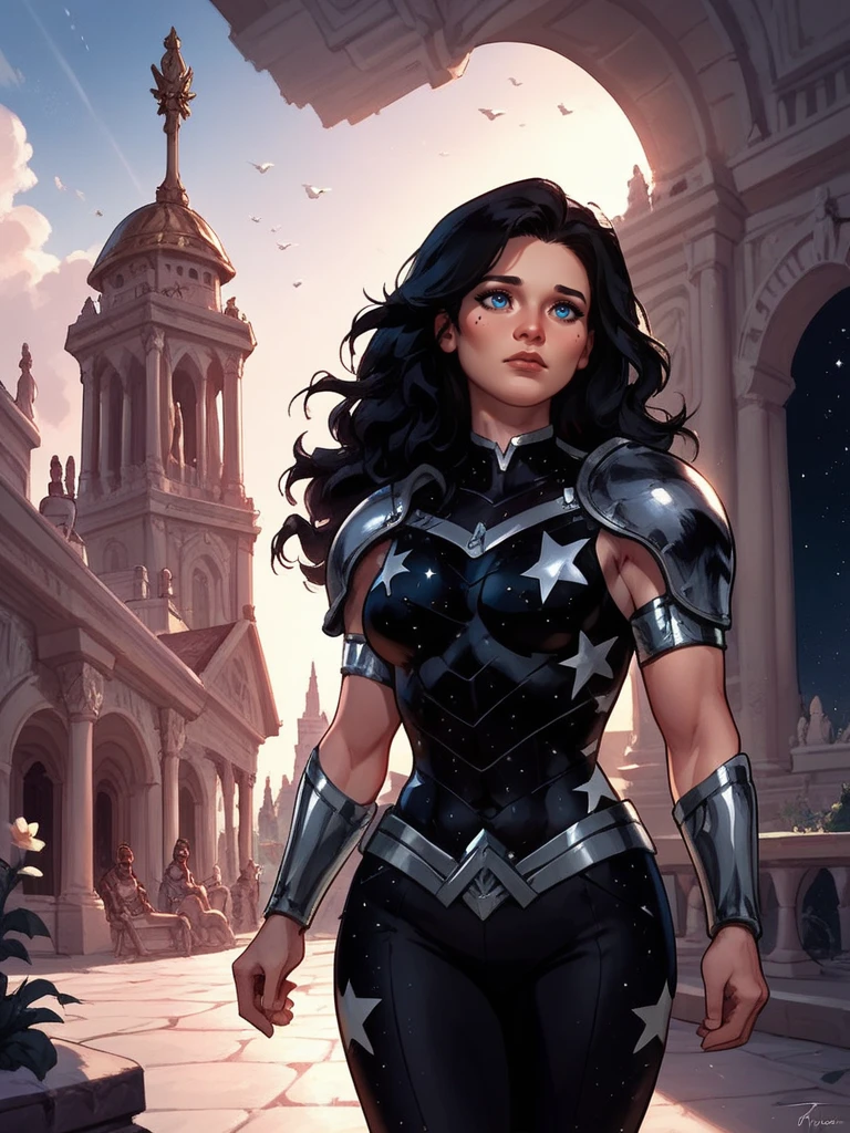 Prompt: Donna Troy, black ????????, star print, thick long black hair, blue eyes, armlets, bracers, shoulder pauldrons,