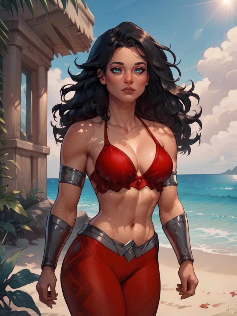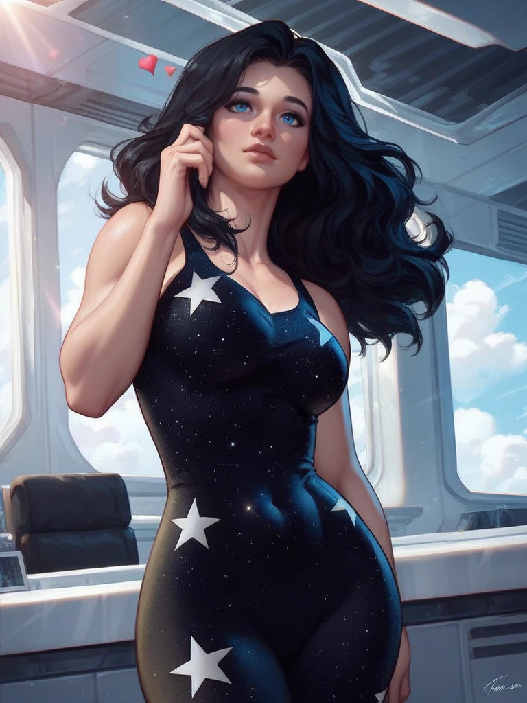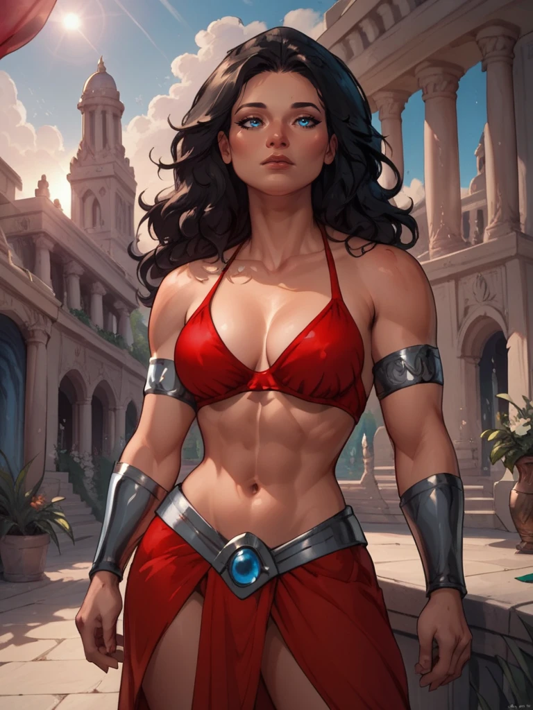 Donna Troy, black ????????, star print, thick long black hair, blue eyes, armlets, bracers, shoulder pauldrons,