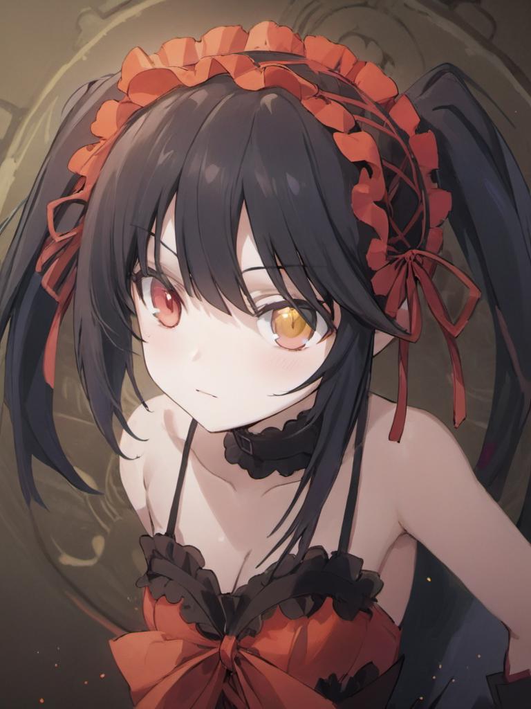 此lora用于基于SDXL1.0的大模型。建议使用如下词条: "a girl with long black twintalls,she has big breasts and sexy cleavage.She is a heterochromia girl,the left eye is red,and the right eye is yellow,there is a clock pattern in her right eye.She is evil smiling.The girl is wearing a lolita_fashion dress,a lolita hairband,wearomg a pair of cross-laced boots and black thighhighs with sling. "建议不要使用太高权重以防止画面出现崩坏。