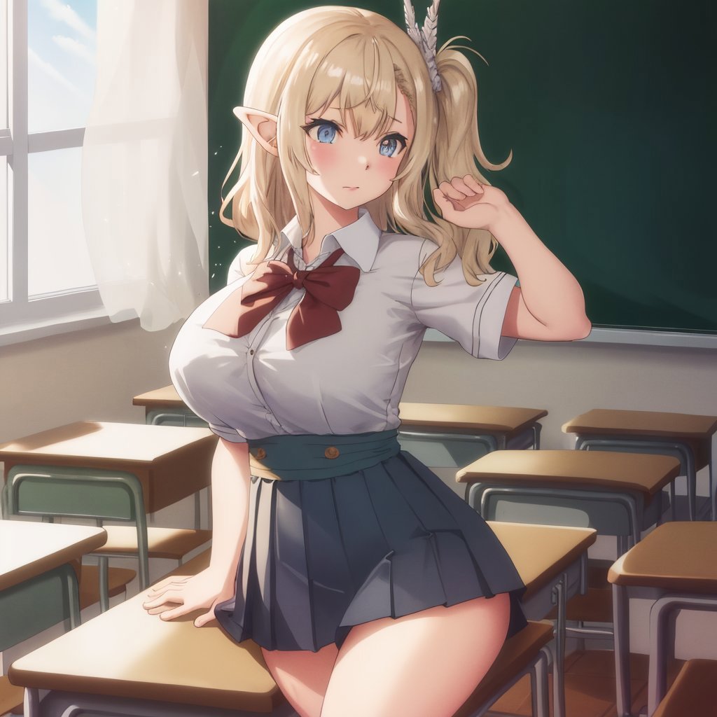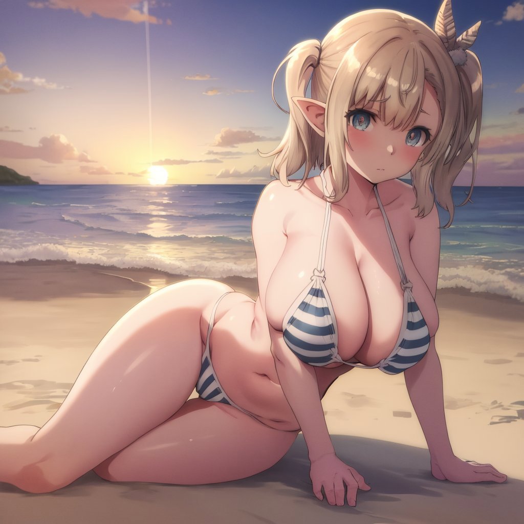 The tags "choker, feathers, side ponytail" can be used to further enhance the character. Her ??????? tend to go in and out of inverted states, even using inverted_nipples won't help.