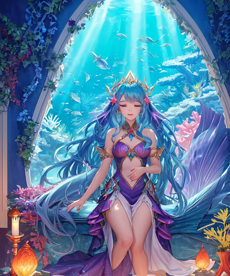 Uma sereia princesa incrivelmente bela com longos, cabelos bioluminescentes fluentes e escamas iridescentes, dormindo pacificamente em uma cama de suave, coral brilhante em um vibrante, fantástico jardim subaquático cheio de exóticos, flora luminosa . Ela usa roupas inspiradas na Atlântida, adornadas com detalhes dourados intrincados e pérolas cintilantes. Um magnífico e exquisito dragão marinho com barbatanas cintilantes e escamas majestosas, seu corpo entrelaçado com videiras de coral brilhante, assiste graciosamente sobre ela, atuando como seu protetor guardião. A luz etérea se filtra através da água cristalina, iluminando a cena com um brilho mágico. altamente detalhado, ultrarrealista, Fantasy Art, iluminação cinematográfica, 8k, detalhes intrincados, obra-prima, iluminação dramática.