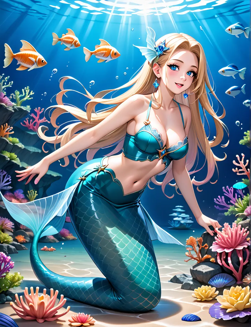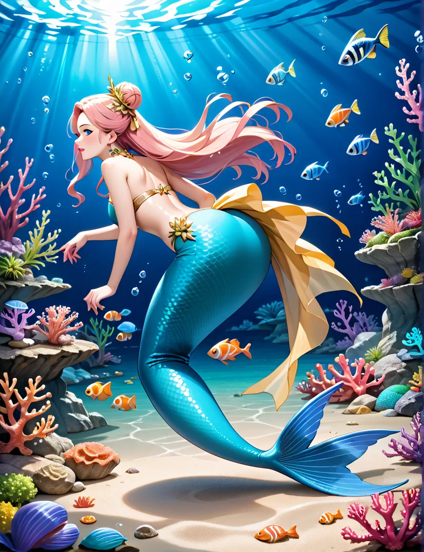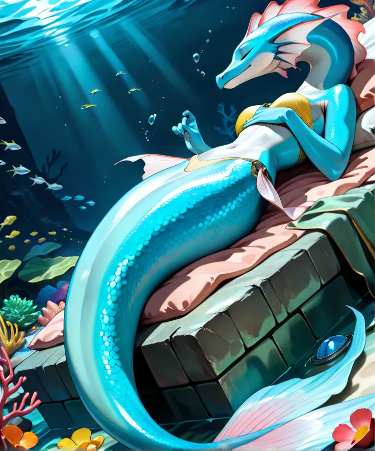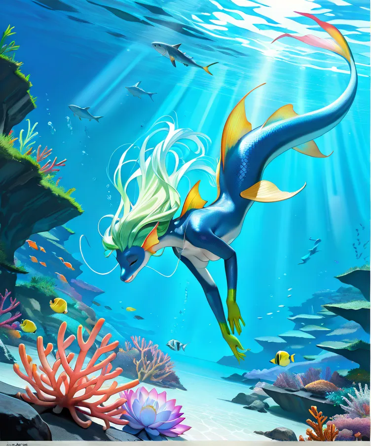 Uma sereia princesa incrivelmente bela com longos, cabelos bioluminescentes fluentes e escamas iridescentes, dormindo pacificamente em uma cama de suave, coral brilhante em um vibrante, fantástico jardim subaquático cheio de exóticos, flora luminosa . Ela usa roupas inspiradas na Atlântida, adornadas com detalhes dourados intrincados e pérolas cintilantes. Um magnífico e exquisito dragão marinho com barbatanas cintilantes e escamas majestosas, seu corpo entrelaçado com videiras de coral brilhante, assiste graciosamente sobre ela, atuando como seu protetor guardião. A luz etérea se filtra através da água cristalina, iluminando a cena com um brilho mágico. altamente detalhado, ultrarrealista, Fantasy Art, iluminação cinematográfica, 8k, detalhes intrincados, obra-prima, iluminação dramática.