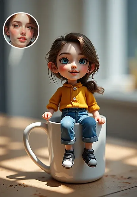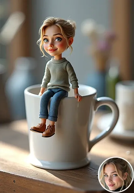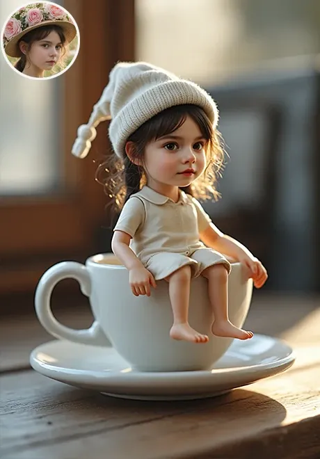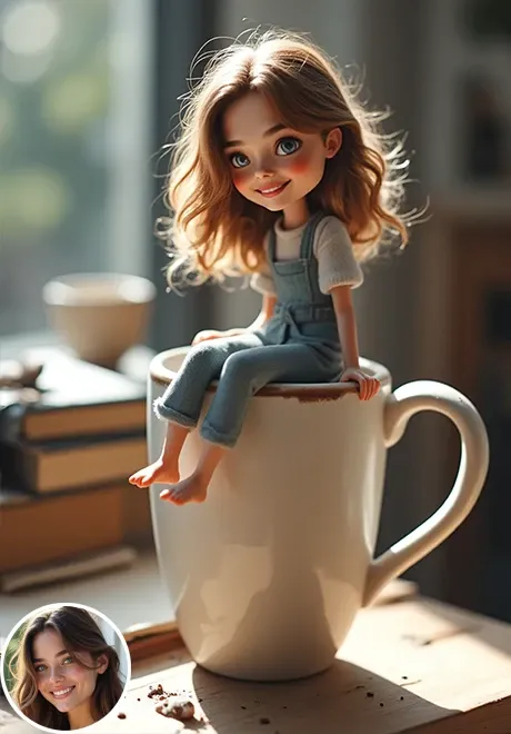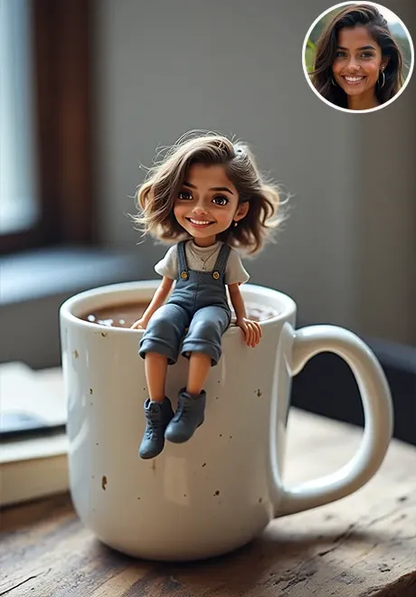 Я обновил это приложение, чтобы персонаж мог сидеть на чашке кофе более естественно, и потребление уменьшилось. Загрузите четкий портрет и нажмите «Создать»