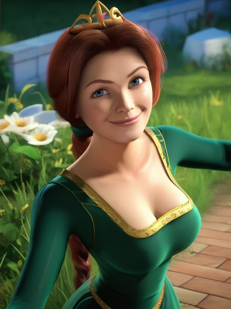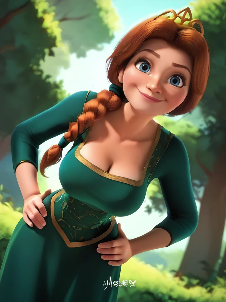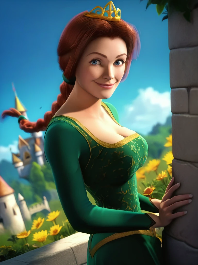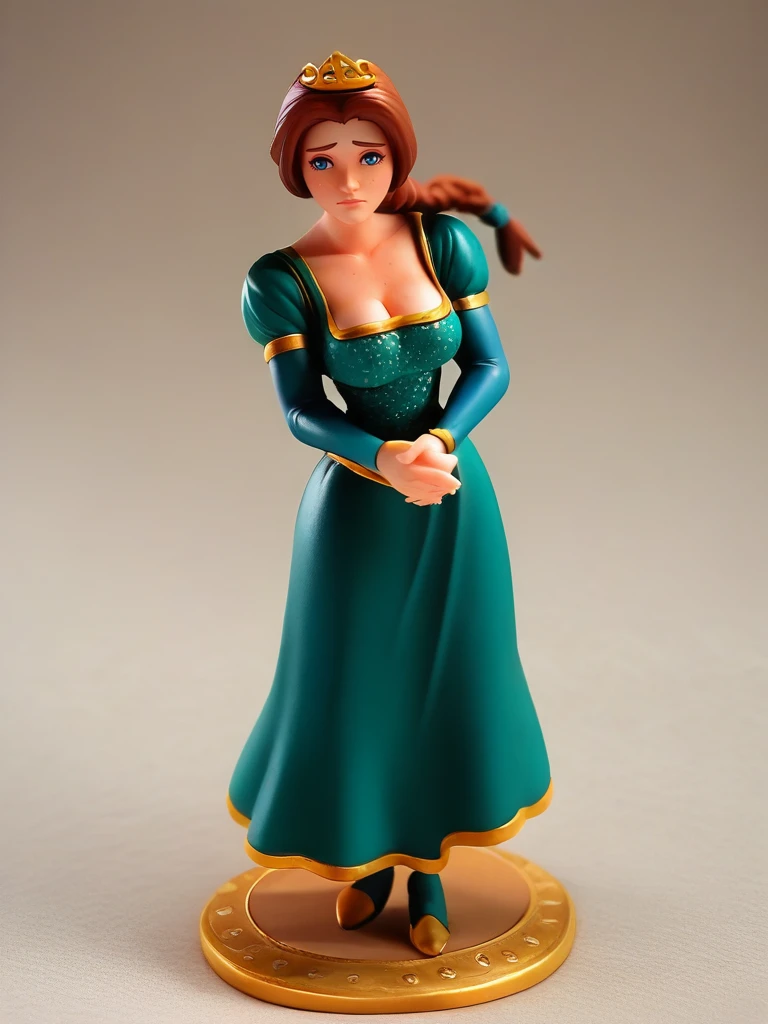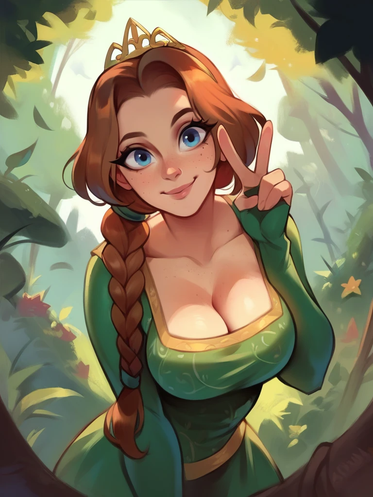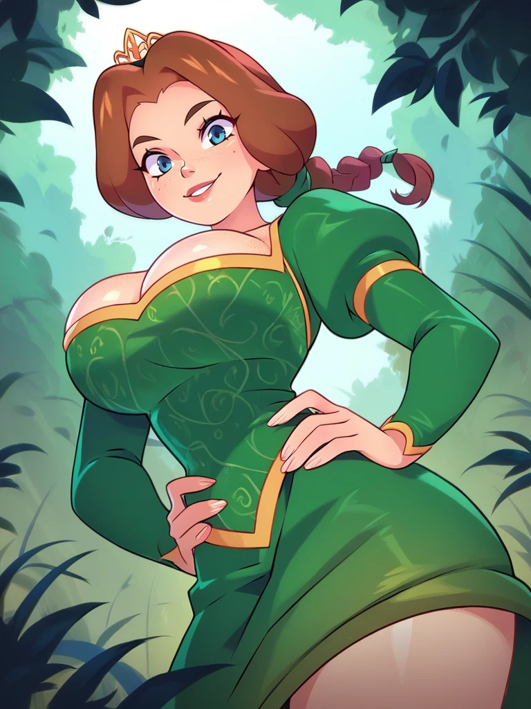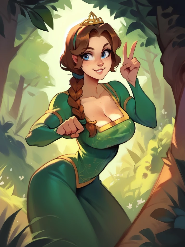 Use the activation word "FionnaXLP" "brown hair, blue eyes, single braid, tiara, green dress, cleavage, freckles" Improve with: "Cartoon".