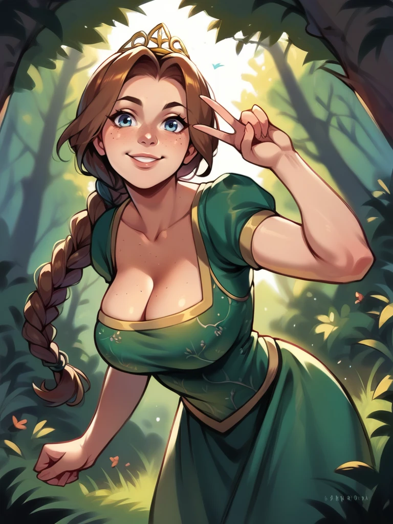 -"brown hair, blue eyes, single braid, tiara, green dress, cleavage, freckles"