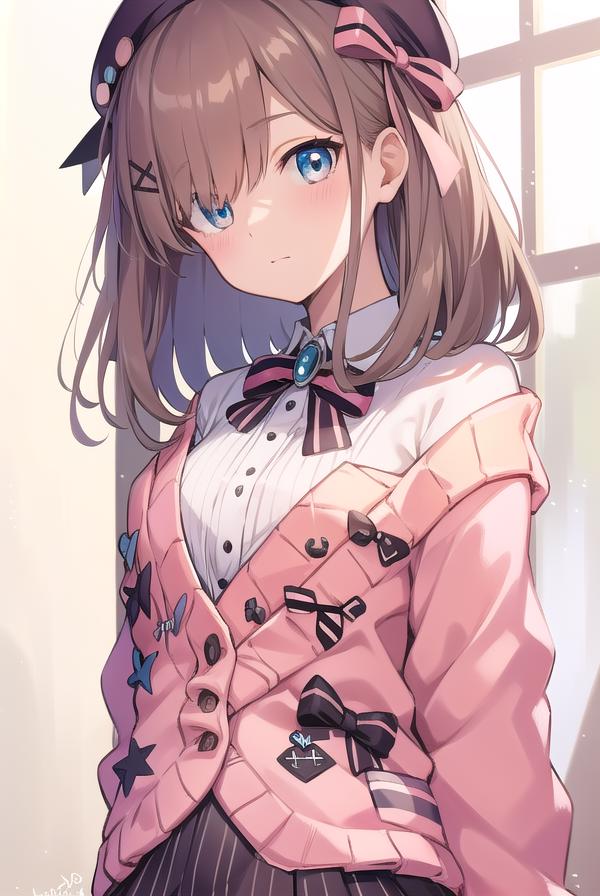 hat, beret, boots, bow, bowtie, brooch, buttons, cardigan, frills, jewelry, pantyhose, ribbon, skirt, striped, striped pantyhose, striped skirt, vertical stripes, vertical-striped pantyhose, virtual youtuber, (pink cardigan:1.5),