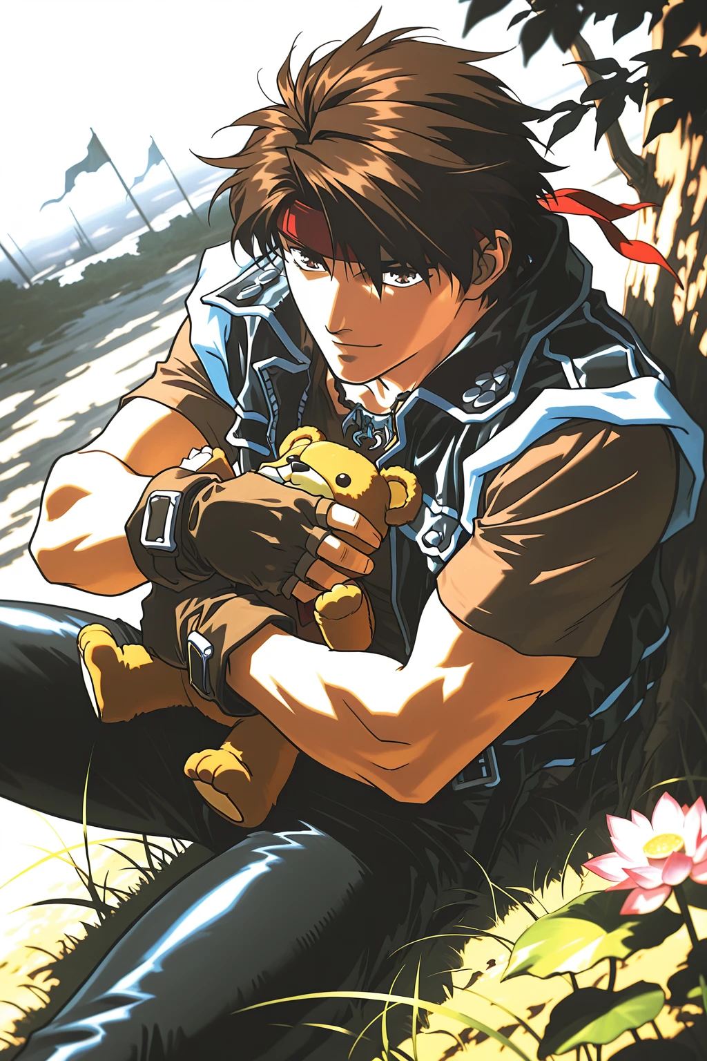red bandana, brown shirt, short sleeves, jacket, necklace, fingerless gloves, brown gloves, black pants, boots