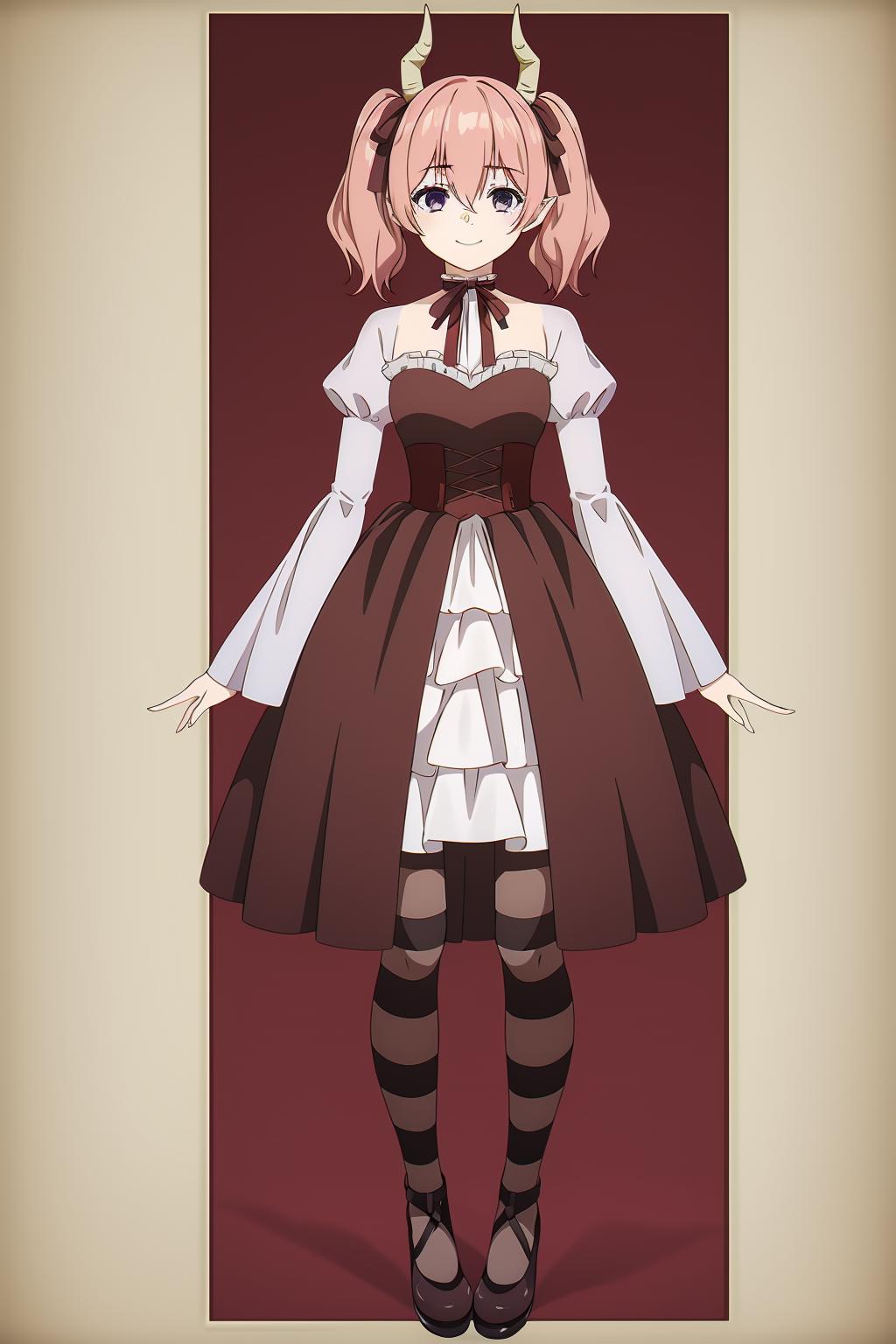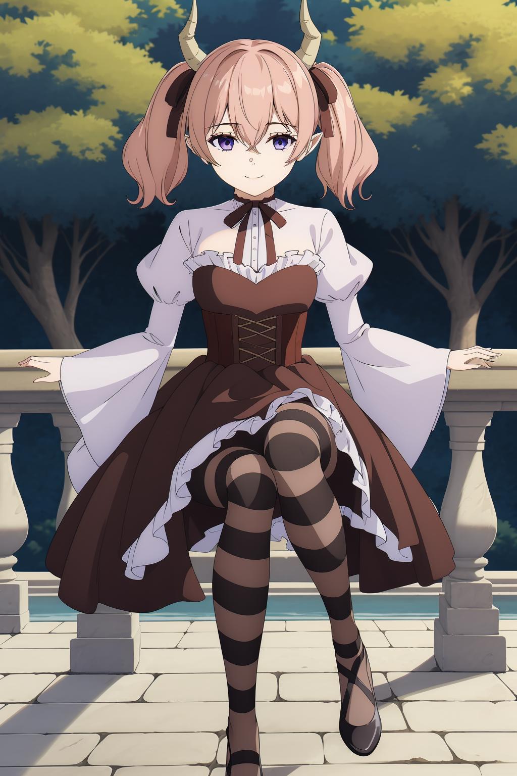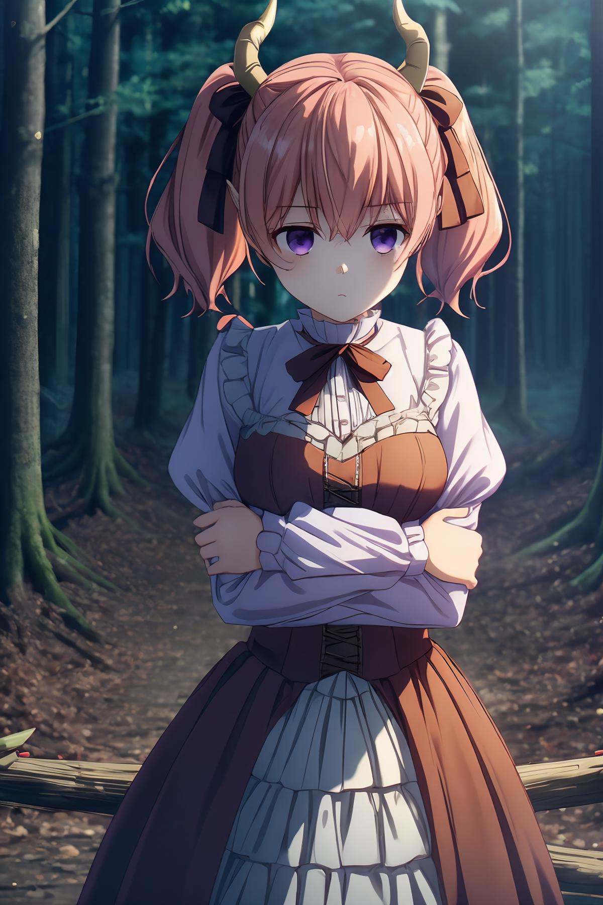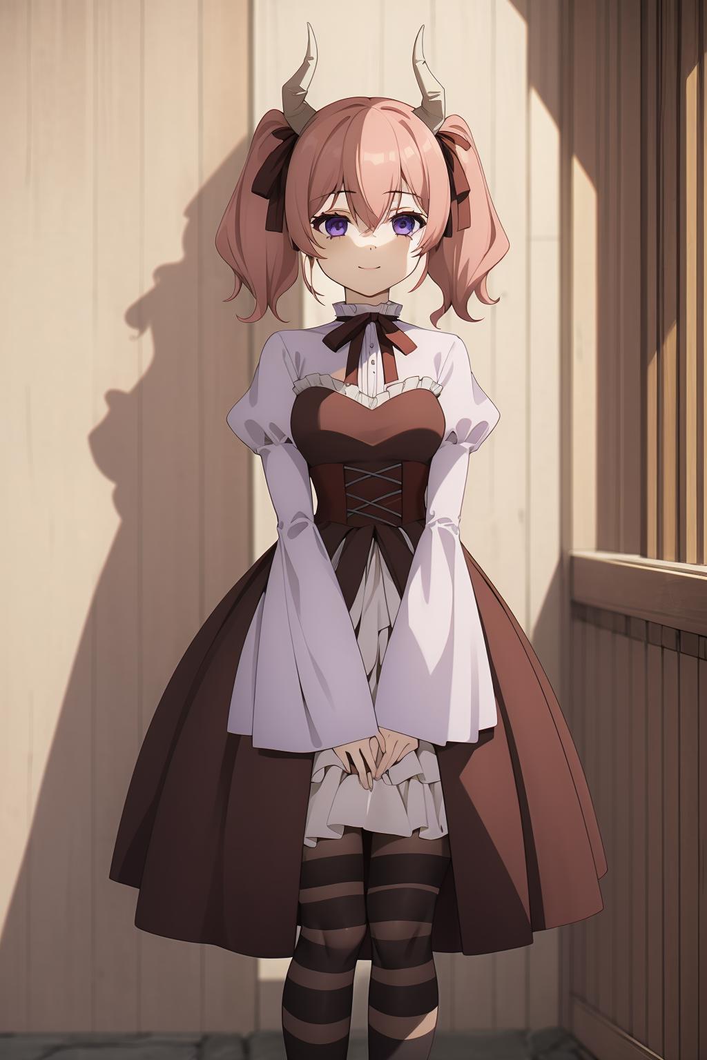 lineye,1girl,solo,short twintails,hair between eyes,pink hair,medium hair,demon horns,dark red hair ribbon,pointy ears,purple eyes
