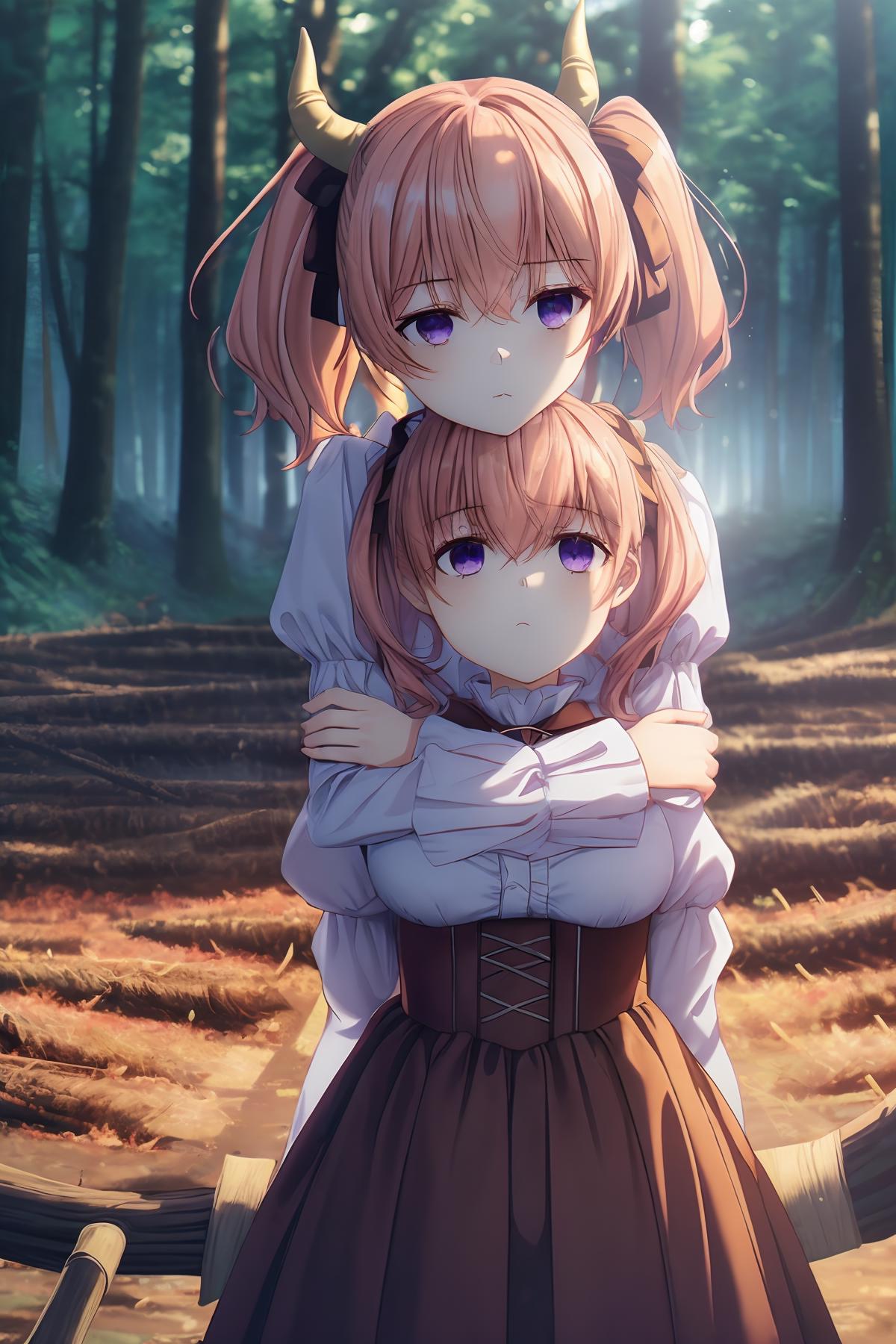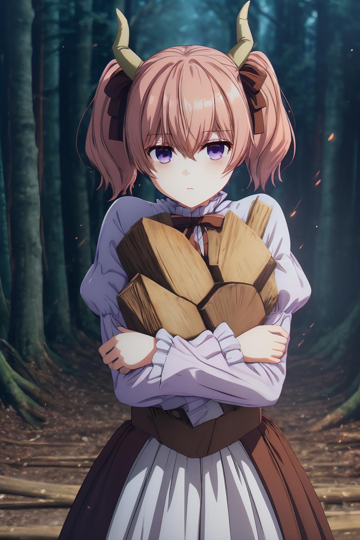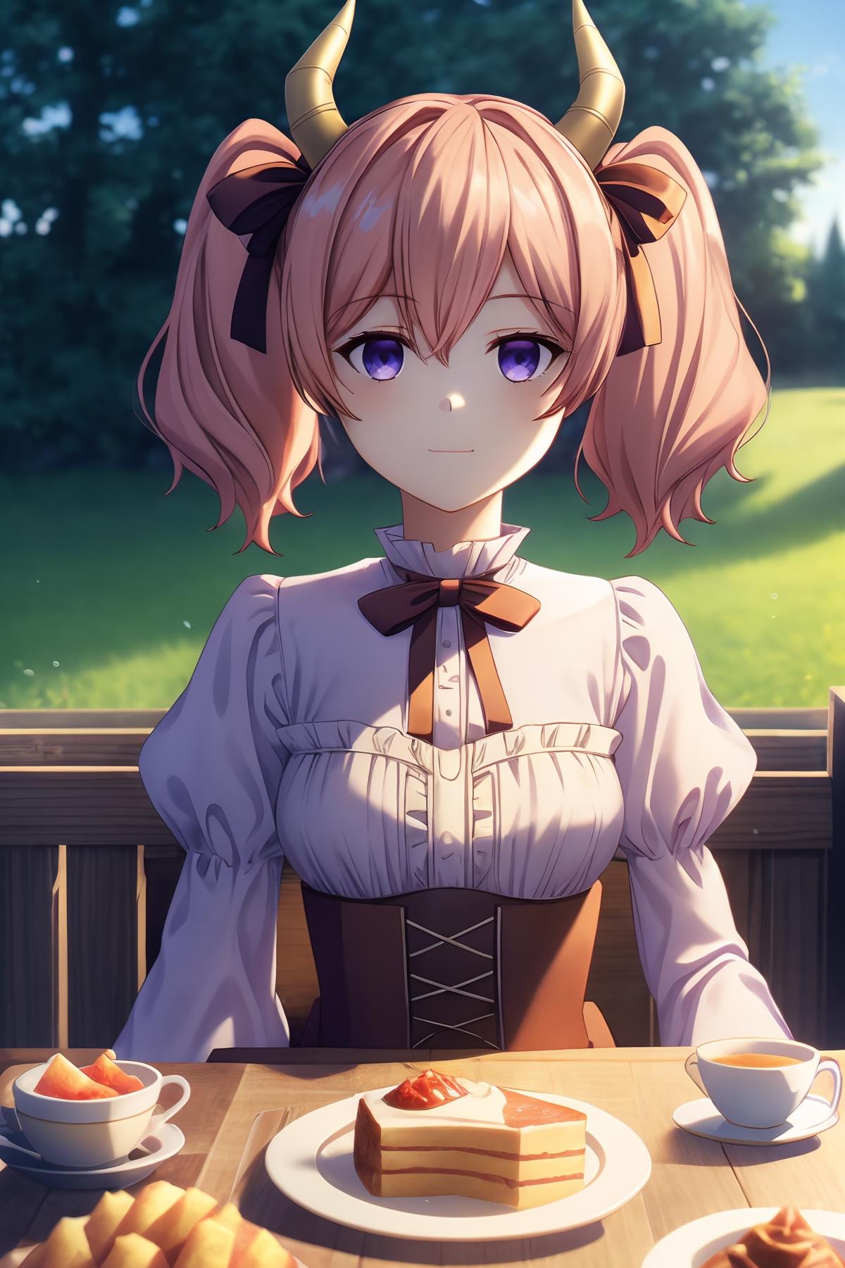 lineye,1girl,solo,short twintails,hair between eyes,pink hair,medium hair,demon horns,dark red hair ribbon,pointy ears,purple eyes