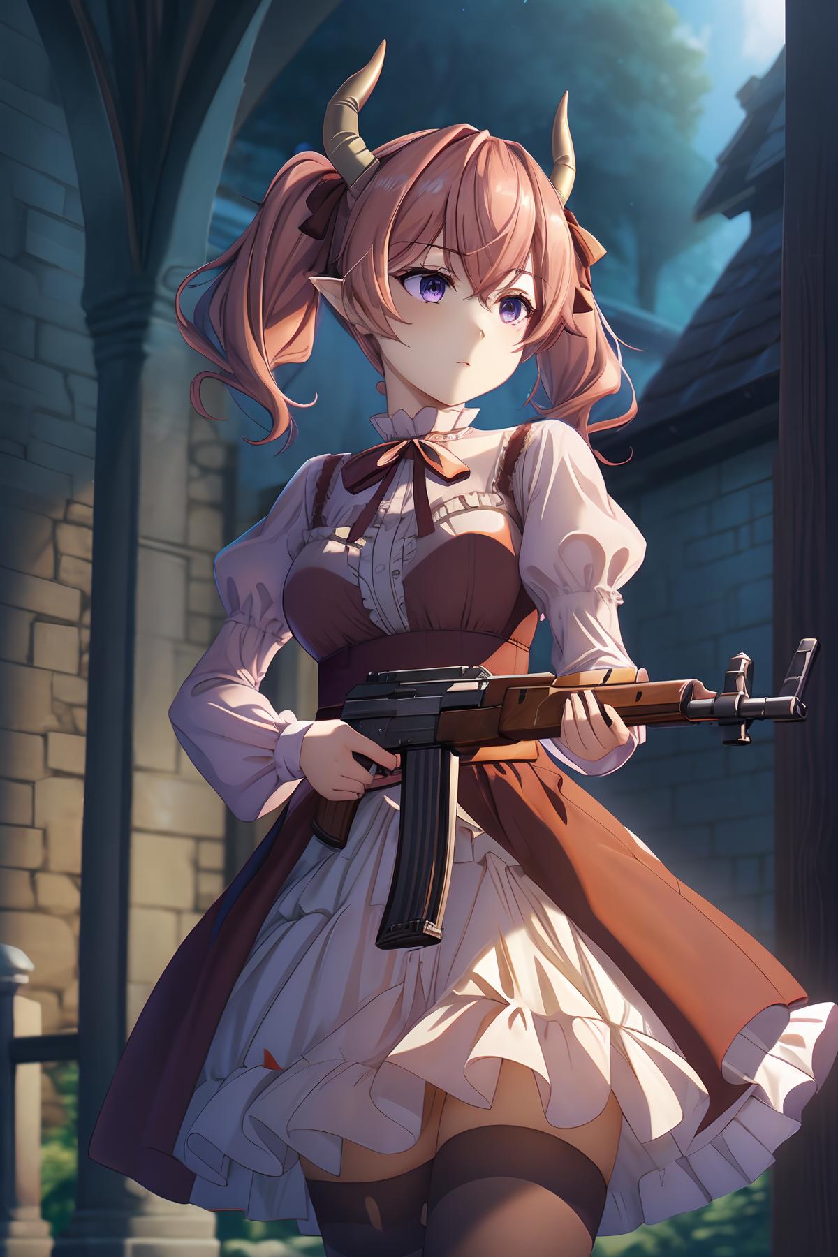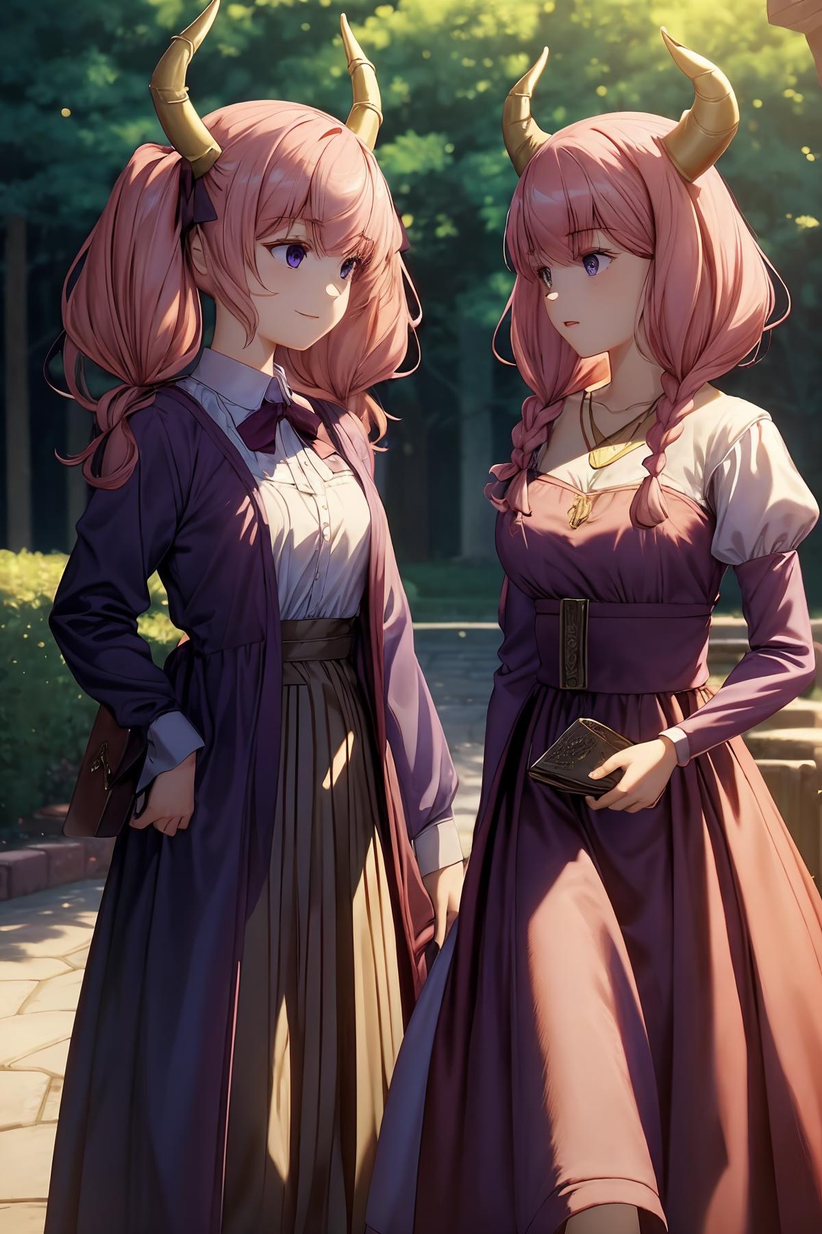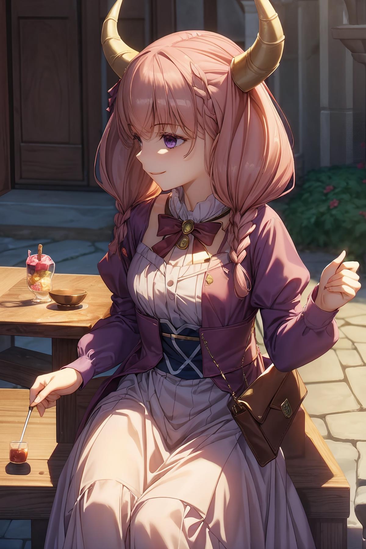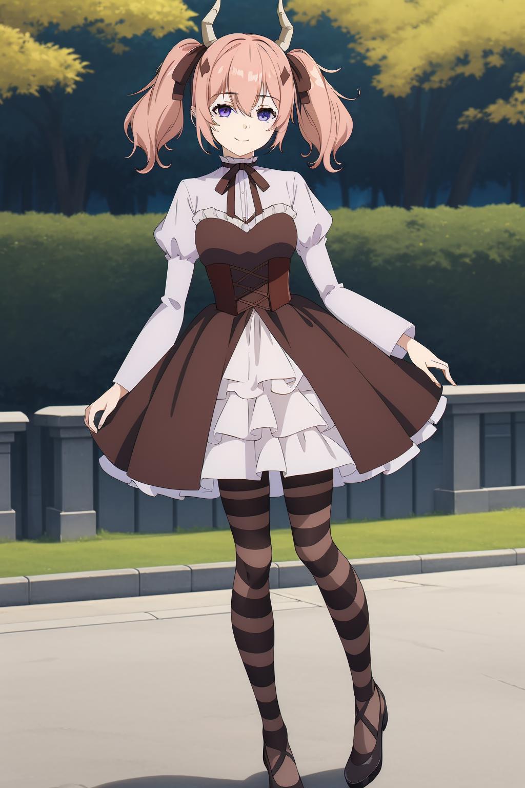 lineye,1girl,solo,short twintails,hair between eyes,pink hair,medium hair,demon horns,dark red hair ribbon,pointy ears,purple eyes