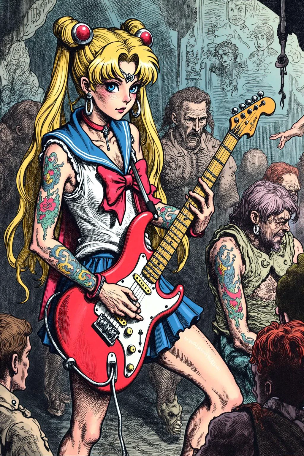 The LoRA has strong effect even without the trigger "gusdore1", but without "illustration" Flux will default to photo style images for most prompts.