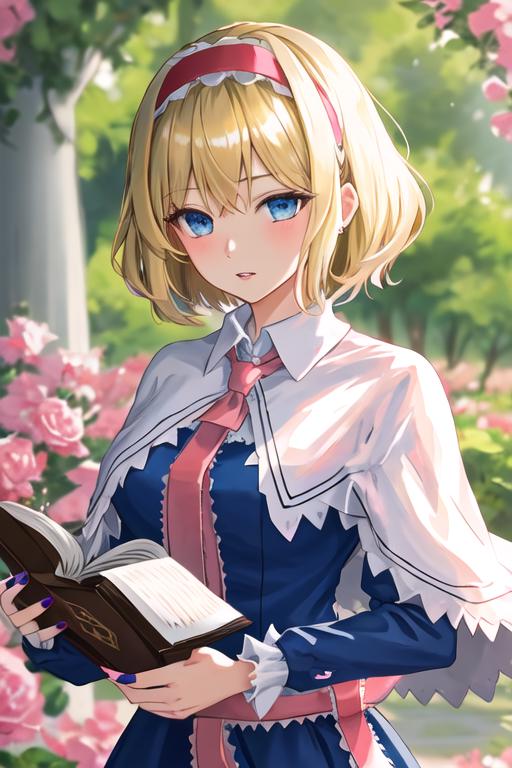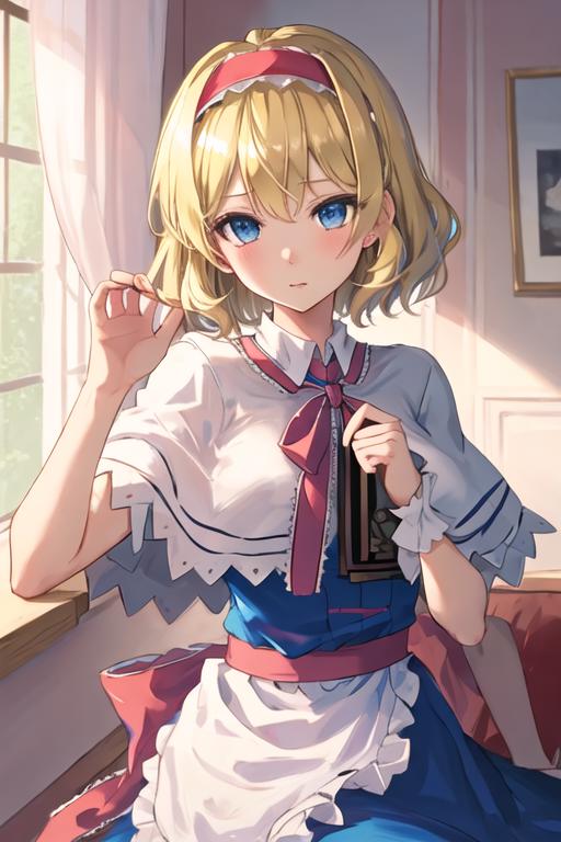 The trigger word is alice_margatroid_touhou, and the recommended tags are masterpiece, best quality, highres, solo, {alice_margatroid_touhou:1.10}, blonde_hair, short_hair, hairband, blue_eyes, capelet.