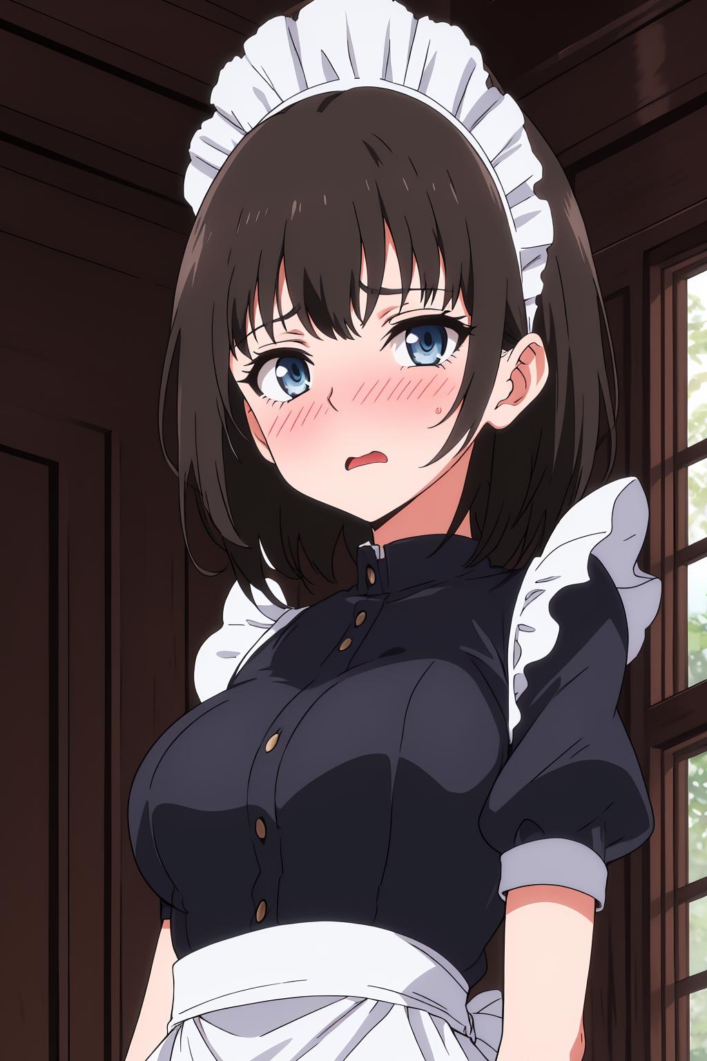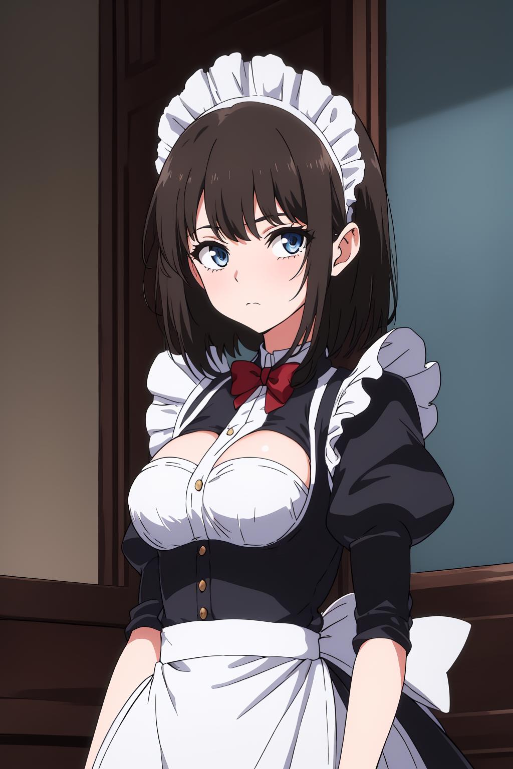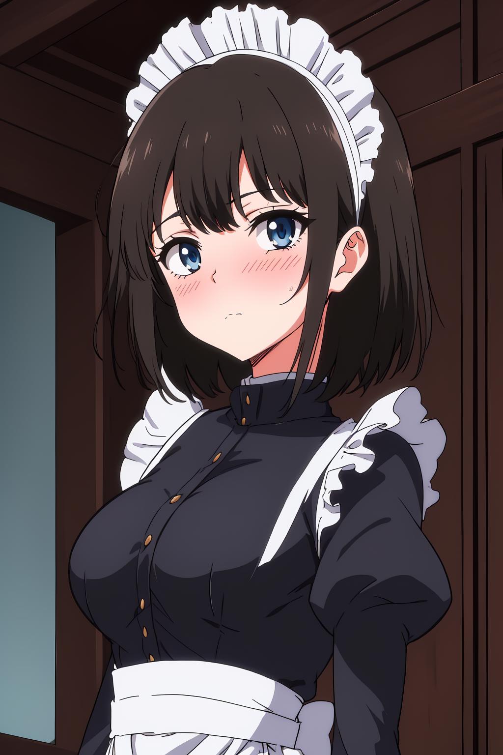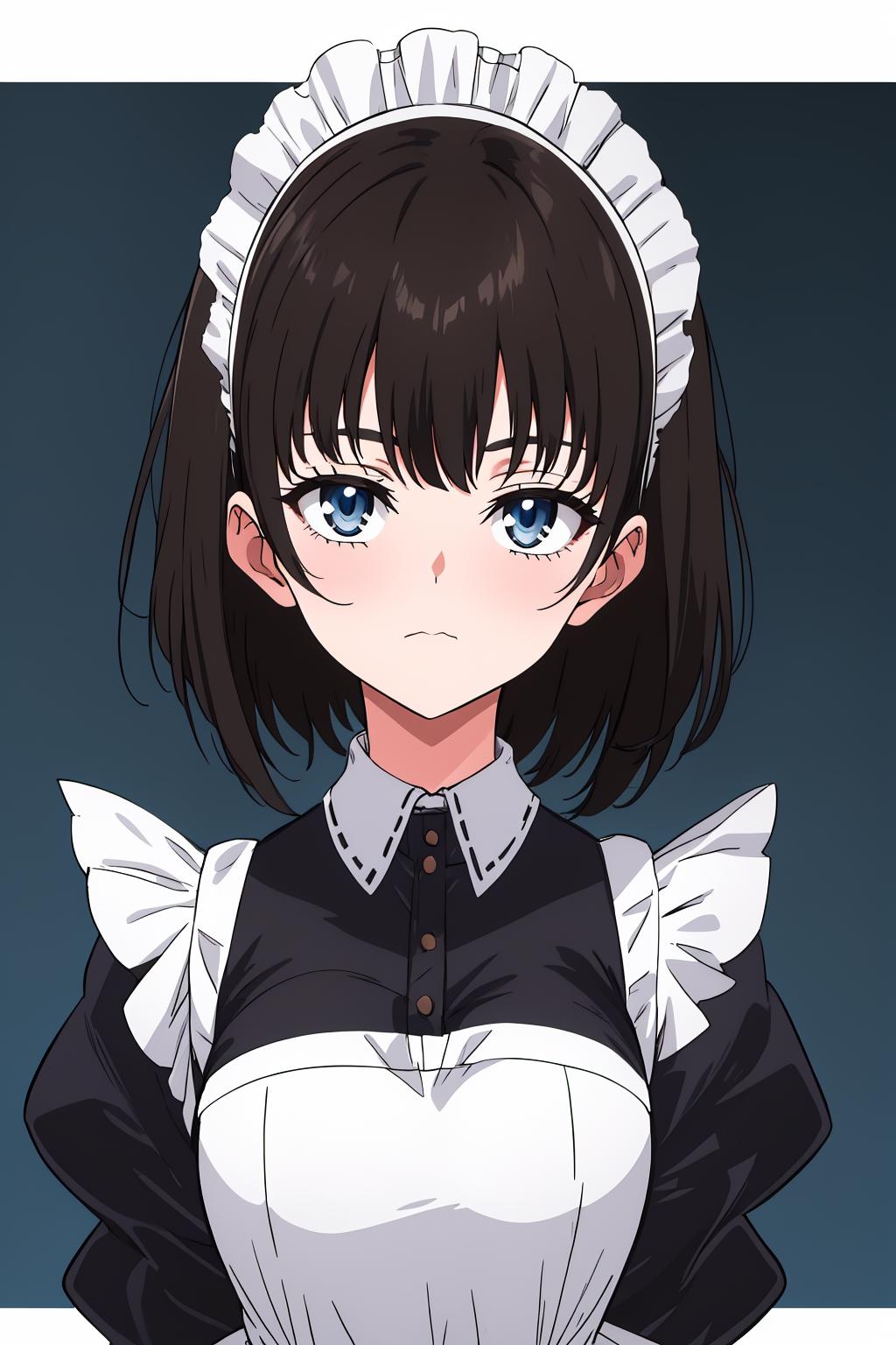 Prompt: rurikawa tsubaki, 1girl, solo, ???????, looking at viewer, short hair, bangs, blue eyes, brown hair, black hair, closed mouth, upper body, puffy sleeves, medium hair, maid, maid headdress, expressionless, indoor, blush