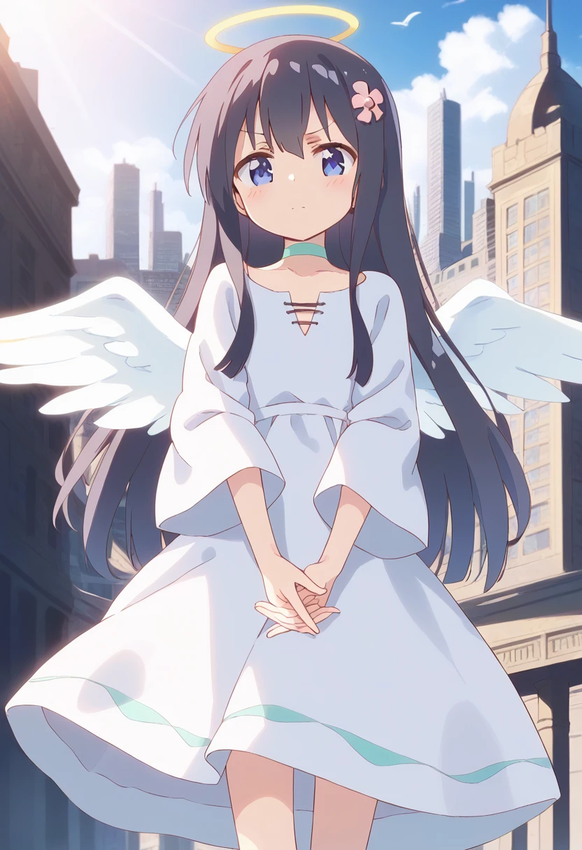 Angel outfit: angel, angel wing, wing, halo, green choker, white dress, wide sleeves,
