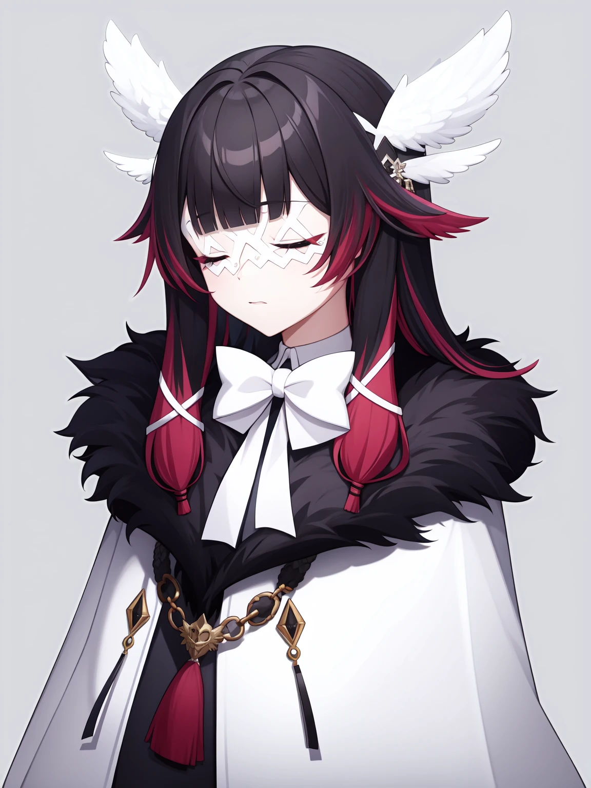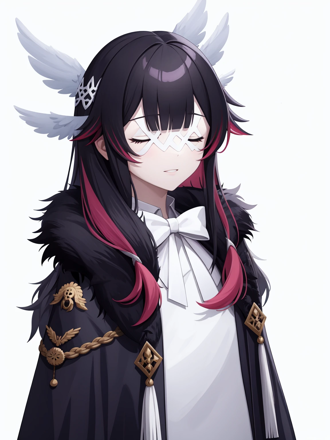 shaonv,multicolored hair,closed eyes,fur trim,eye mask,black hair,white bow,fur-trimmed coat,pink hair,hair ornament,ribbon,two-tone hair,white mask,blunt bangs,white head wings,red hair, sleeveless dress,streaked hair