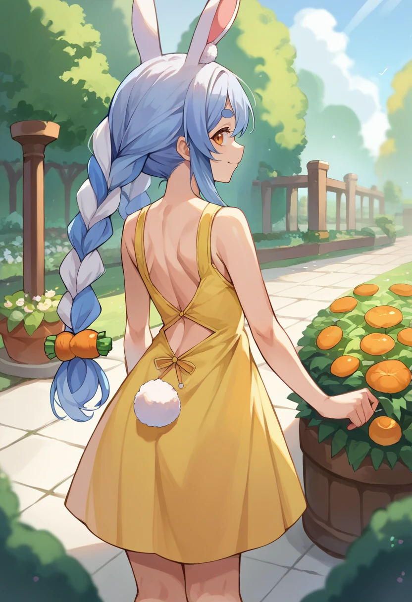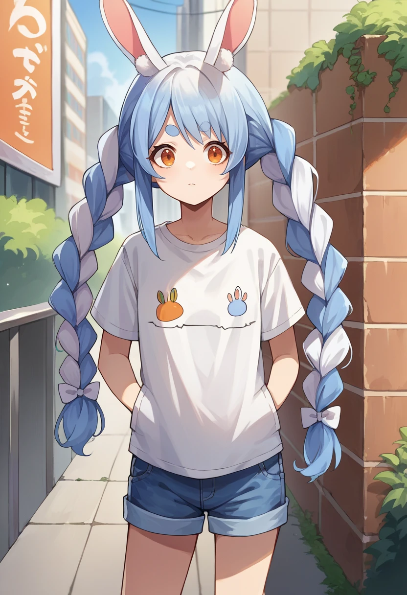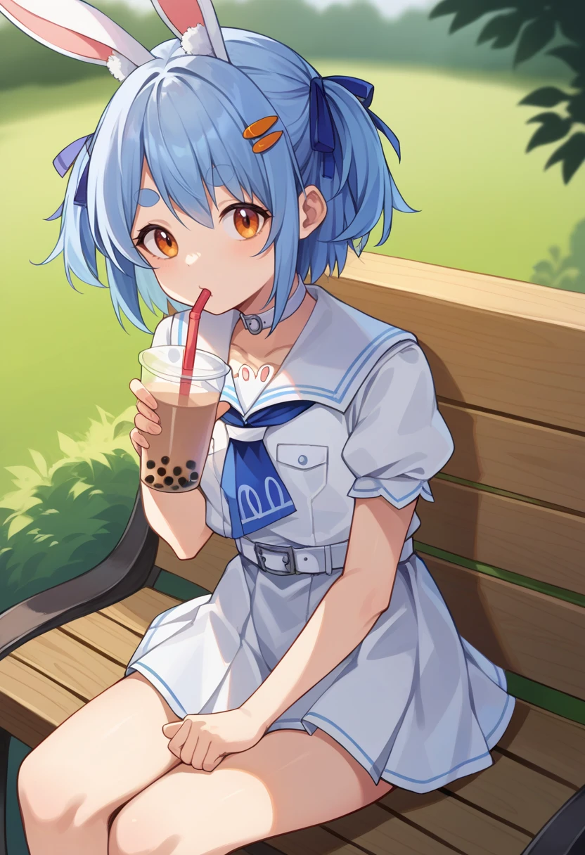 PekoraCasual, orange eyes, thick eyebrows, rabbit ears, blue hair, short hair, two side up, hairclip, white choker, sailor dress, short dress, short sleeves, blue neckerchief, white belt