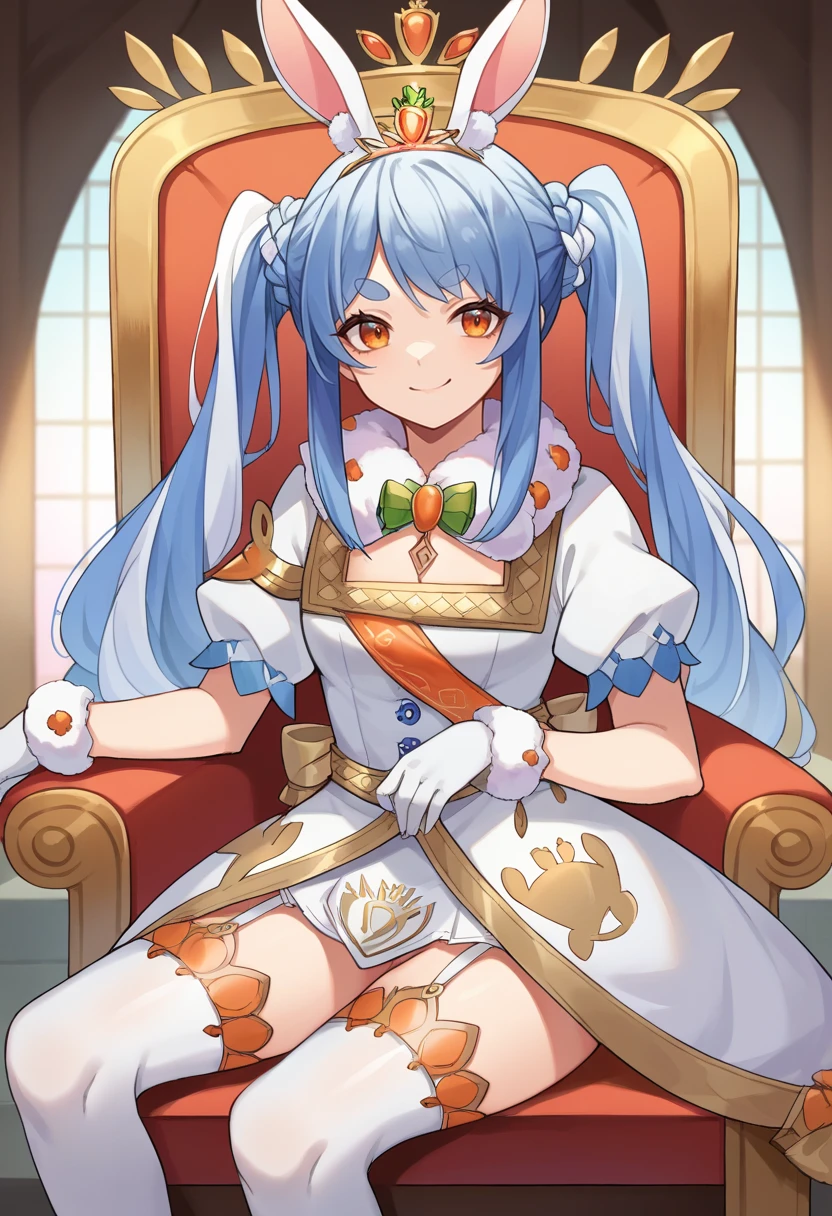 PekoraBase, orange eyes, thick eyebrows, rabbit ears, two-tone hair, blue hair, white hair, long hair, twin braids, hair ornament, fur collar, white dress, fur-trimmed dress, bare shoulders, black leotard, strapless, cleavage, detached sleeves, puffy short sleeves, black gloves, black pantyhose