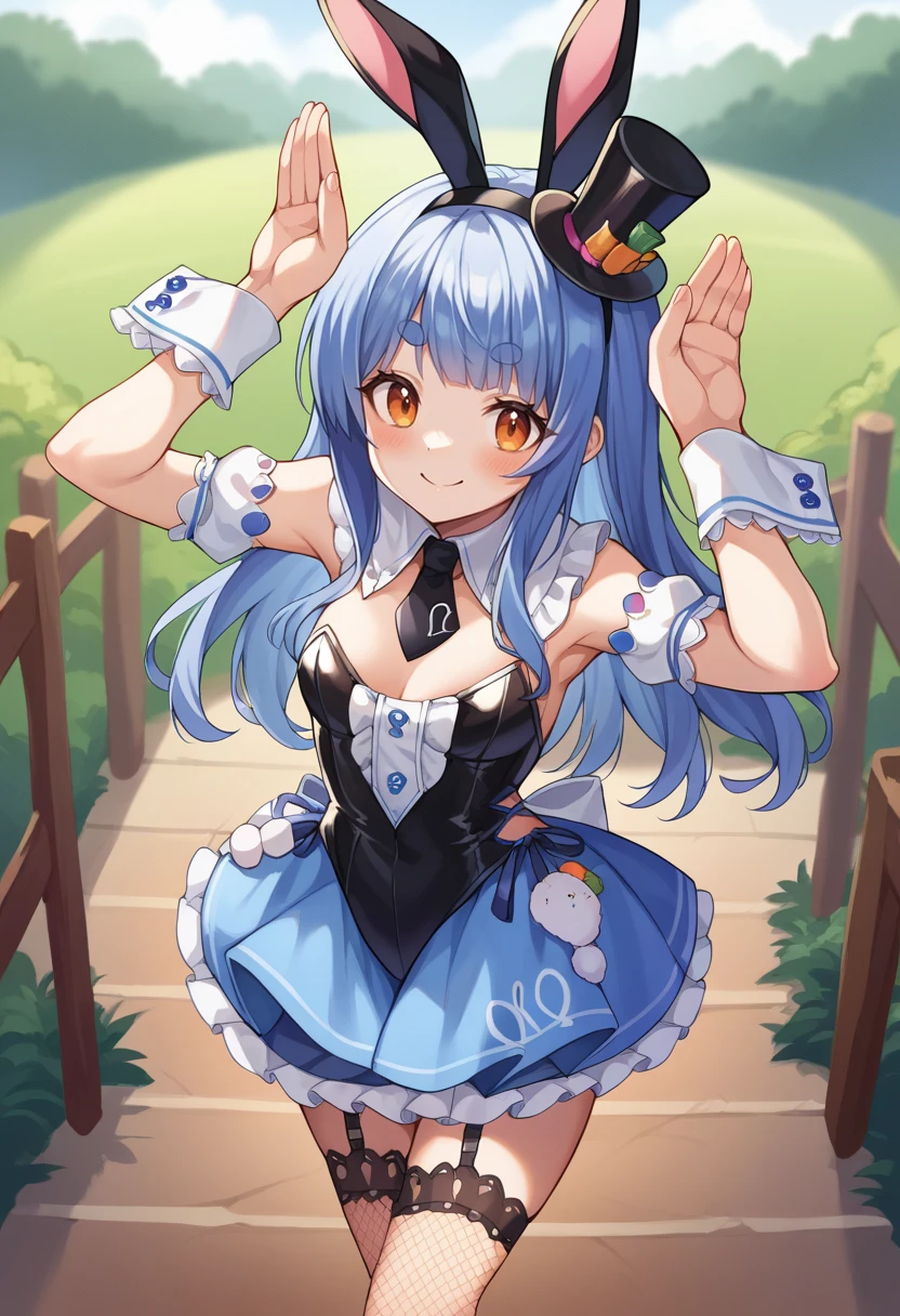 PekoraFuriFuri, orange eyes, thick eyebrows, fake animal ears, black hairband, blue hair, long hair, mini top hat, tilted headwear, detached collar, short black necktie, black dress, short dress, sleeveless dress, center frills, puffy short sleeves, detached sleeves, wrist cuffs, blue skirt, fishnet thighhighs, garter straps