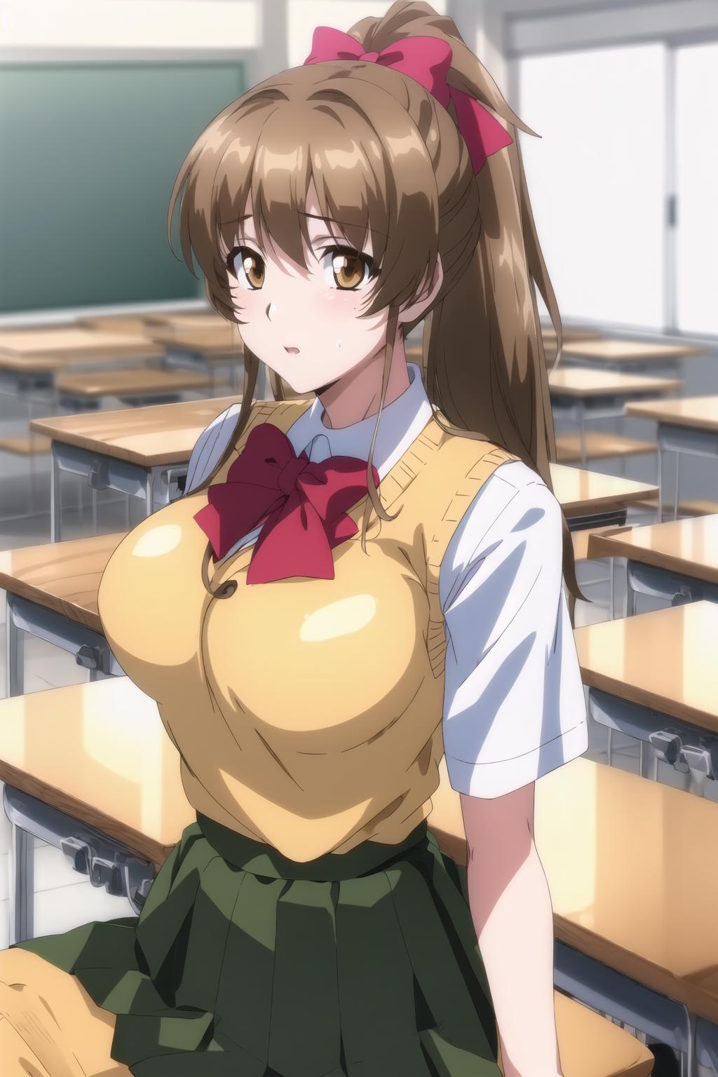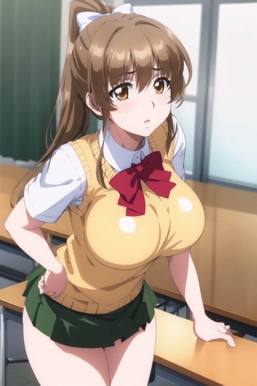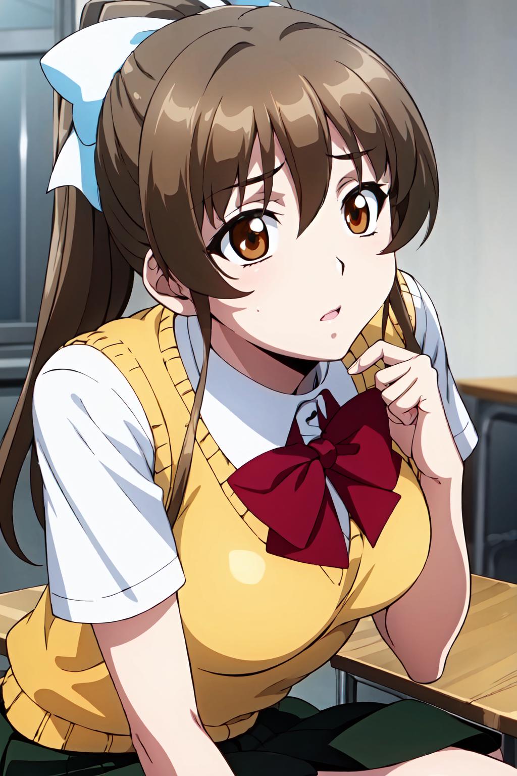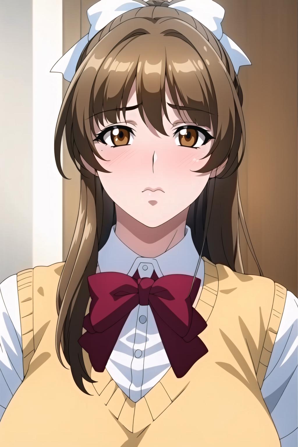 school uniform, red bowtie,Yellow_Vest,white shirt,collared shirt,brown pleated skirt,