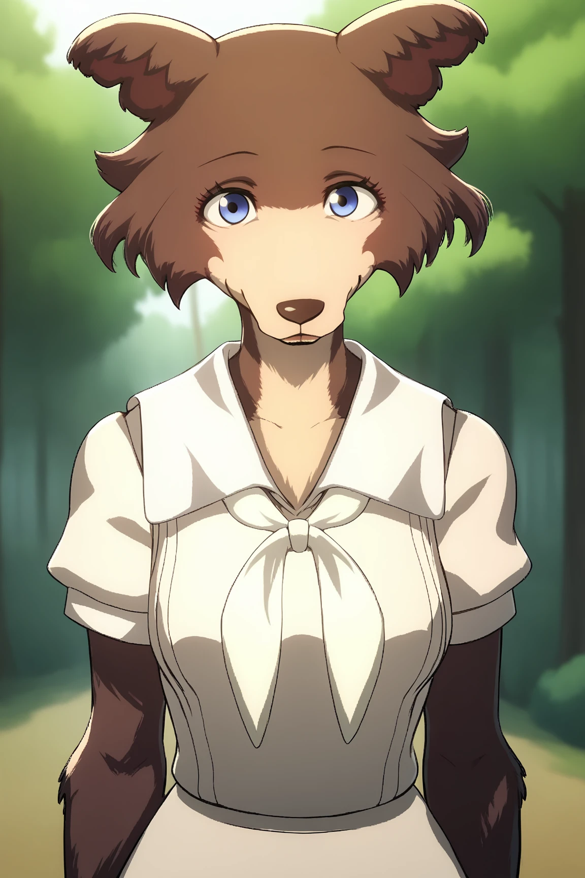 ➜ JunoBPXL, juno_\(beastars\),, anthro furry, furry female, body fur, brown fur, blue eyes, animal ears, wolf ears, ??????????????, wolf tail, school uniform, white dress, white neckerchief, (short sleeves), belt, white skirt, white socks, black shoes