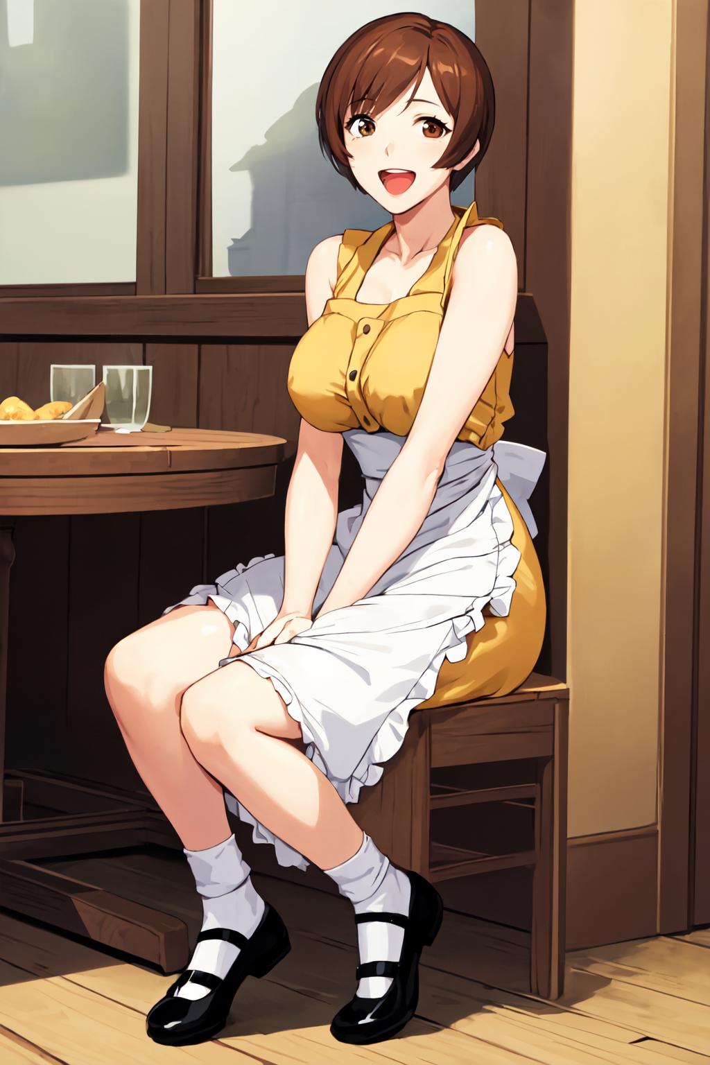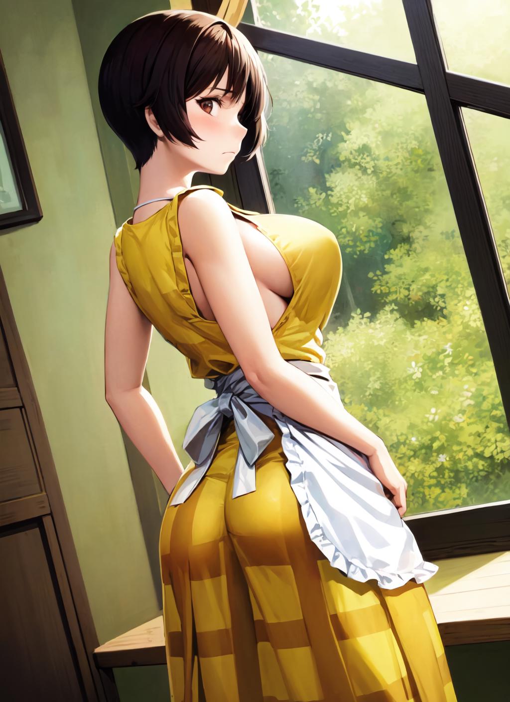 This one is quite straightforward: just her default yellow dress and apron outfit. Depending on the artist the dress is either plain yellow or includes a checkered pattern, so you will get both. Also, training data includes some images of her in the white one-piece swimsuit from the game, but probably not enough to be properly learned.