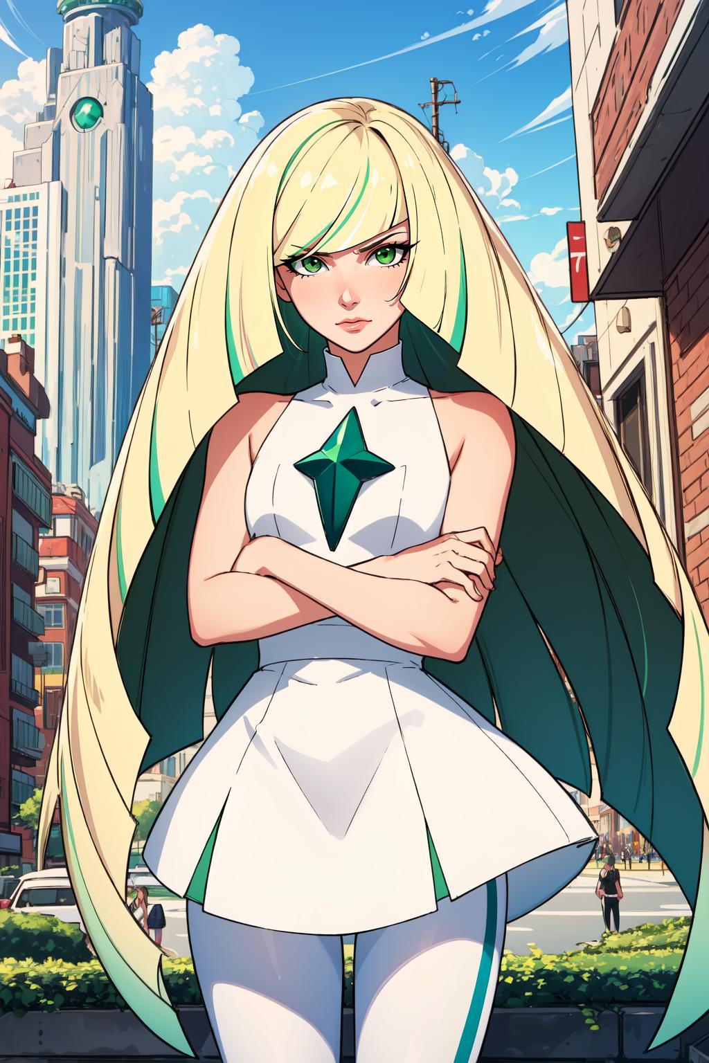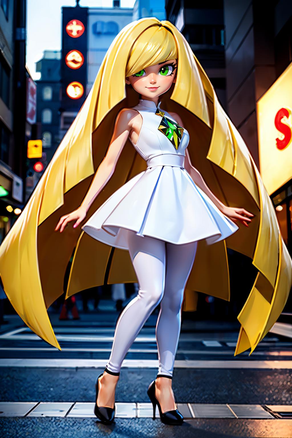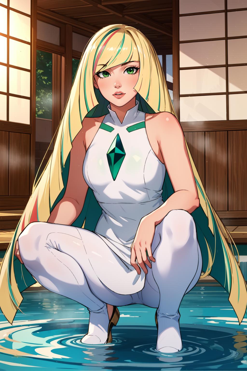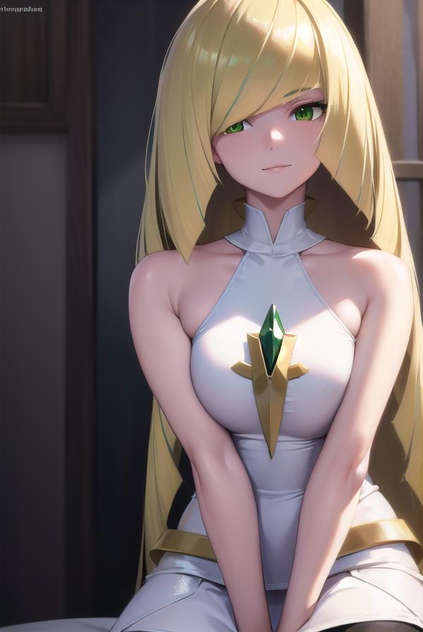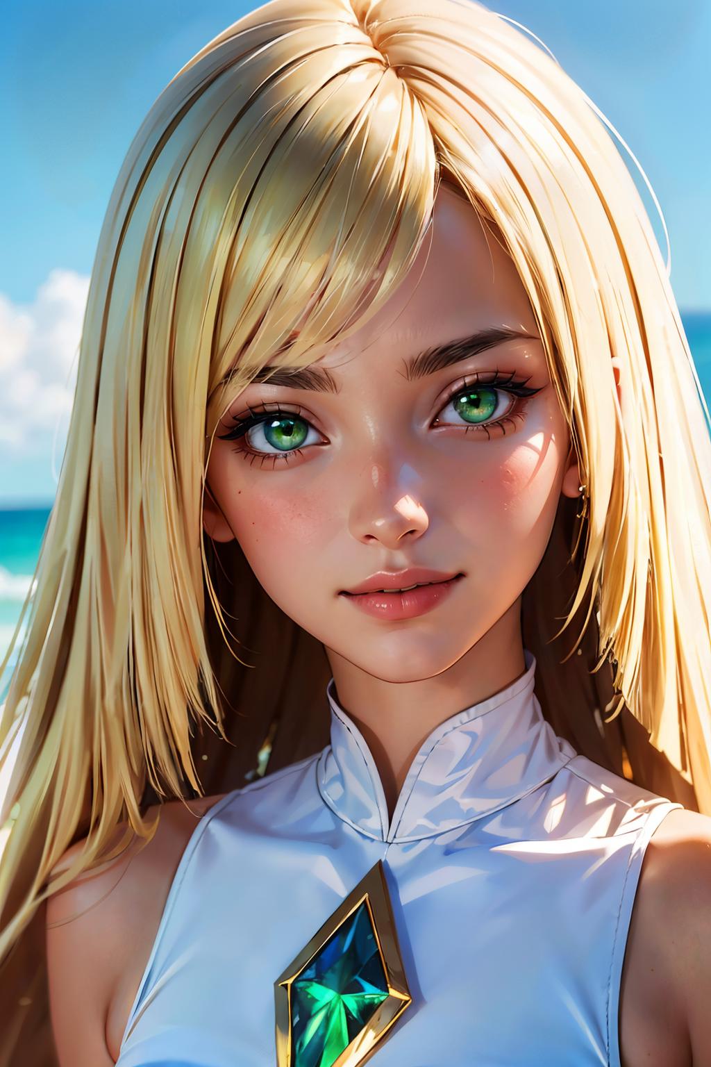 pokemonlusamine, blonde hair, (green eyes:1.5), hair over one eye, long hair, multicolored hair, streaked hair, very long hair,