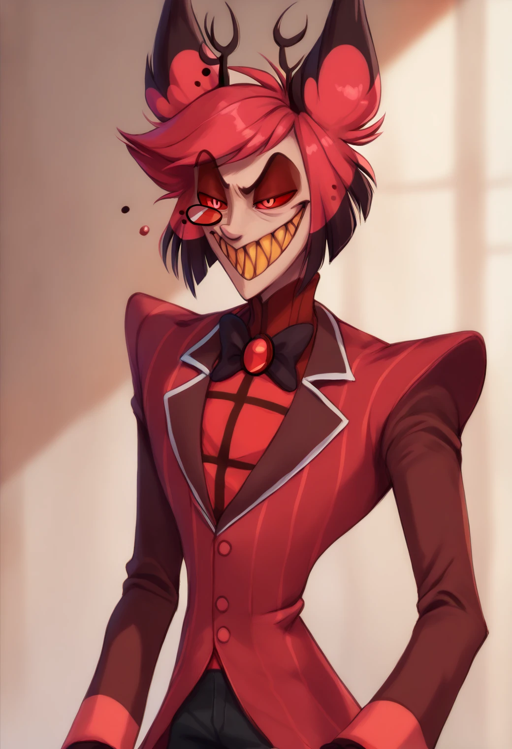 alastor, monocle, pink suit, pink coat, black bowtie, black pants, fingerless gloves, black gloves