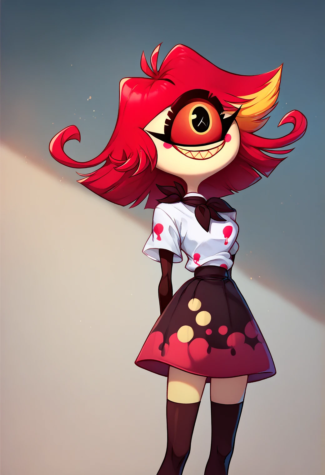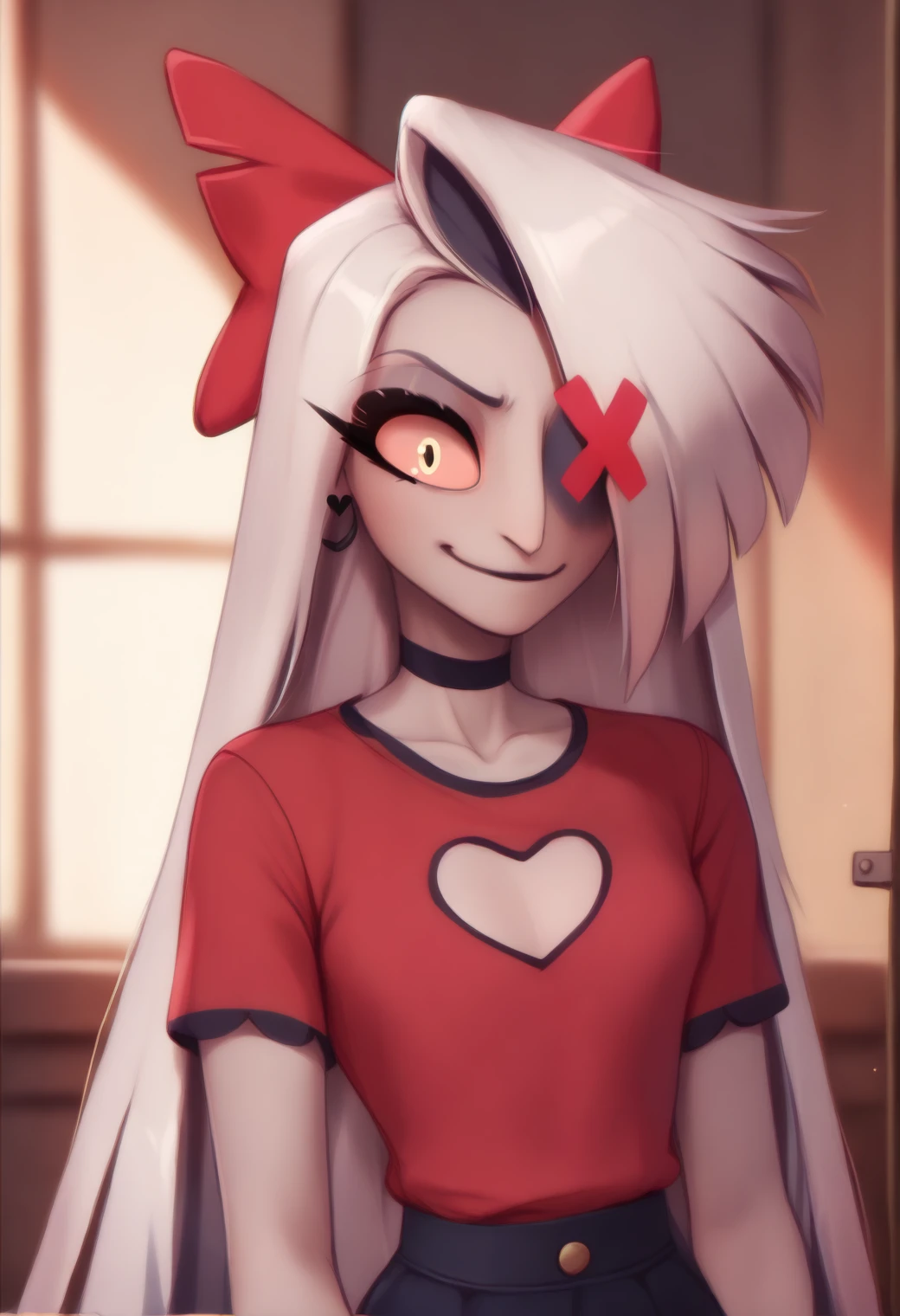 vaggie, red shirt, short sleeves, collared shirt, black choker, midriff, black skirt, grey elbow gloves, fingerless gloves, grey thighhighs, red hair bow, red hair ribbon