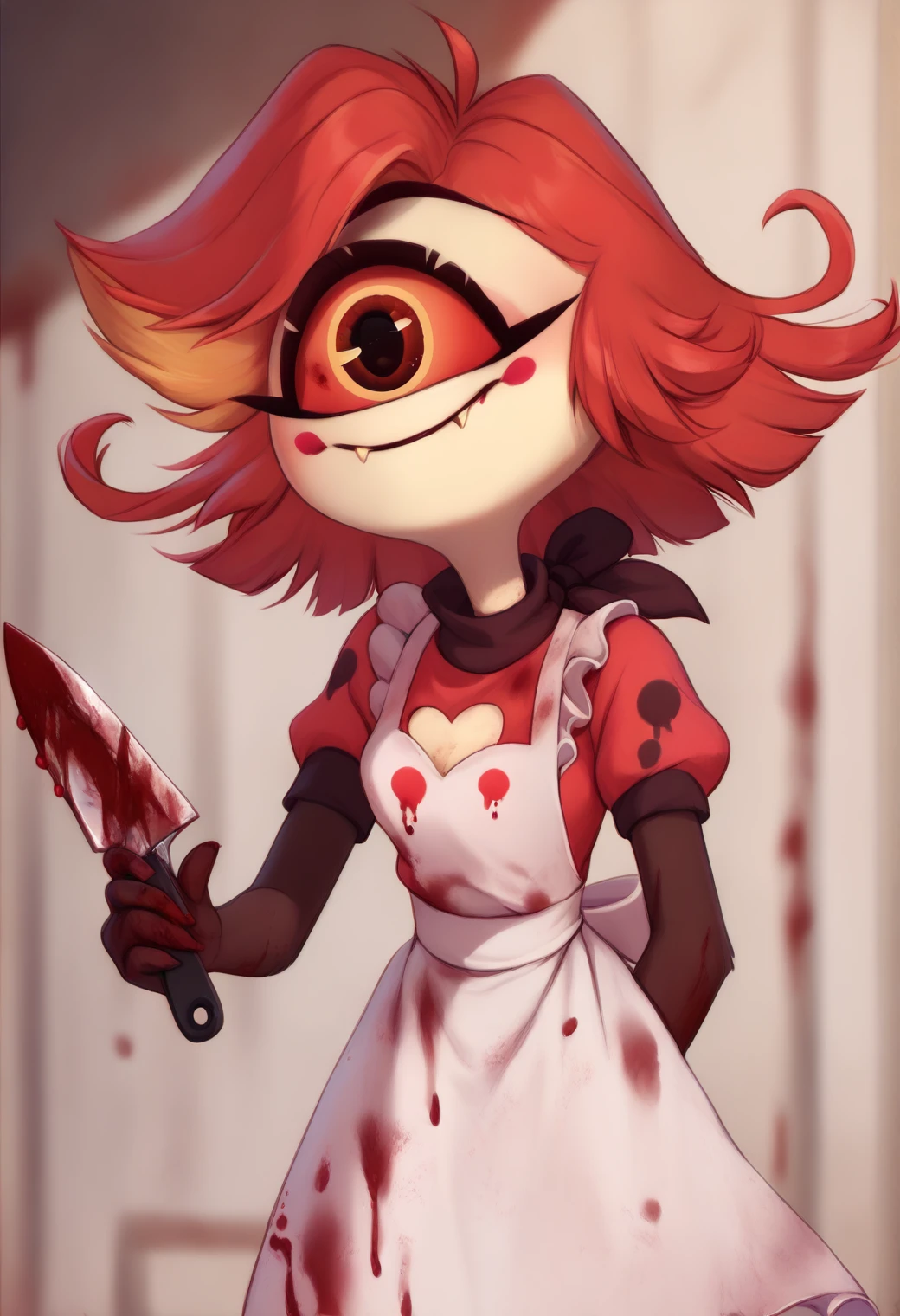 niffty, white apron, paint splatter, maid, pink skirt, black pantyhose, black elbow gloves