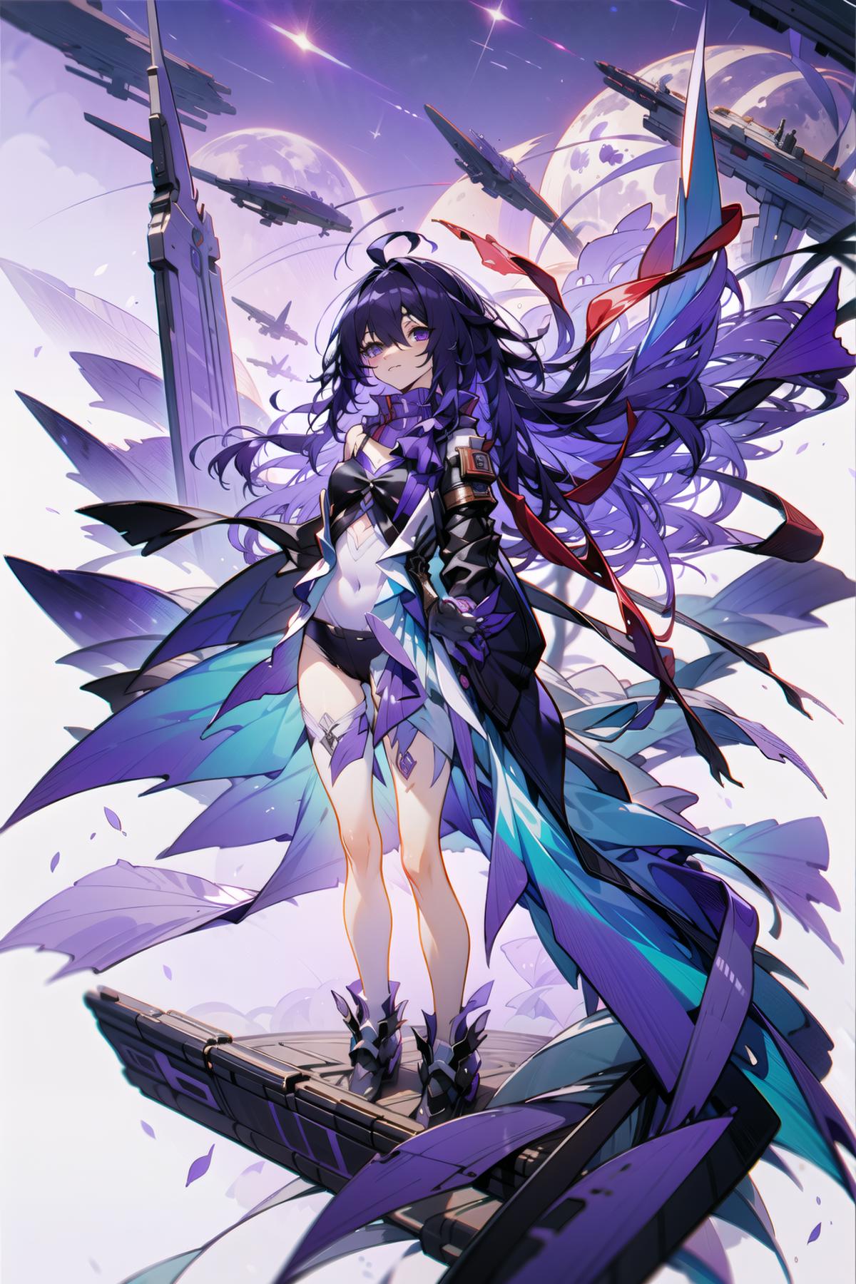 seele hsr, 1girl, solo, purple_hair, long_hair, ???????, bangs, gloves, cleavage, hair_between_eyes, closed_mouth, purple_eyes, boots, black_gloves, fingerless_gloves, black_footwear, blue butterfly,