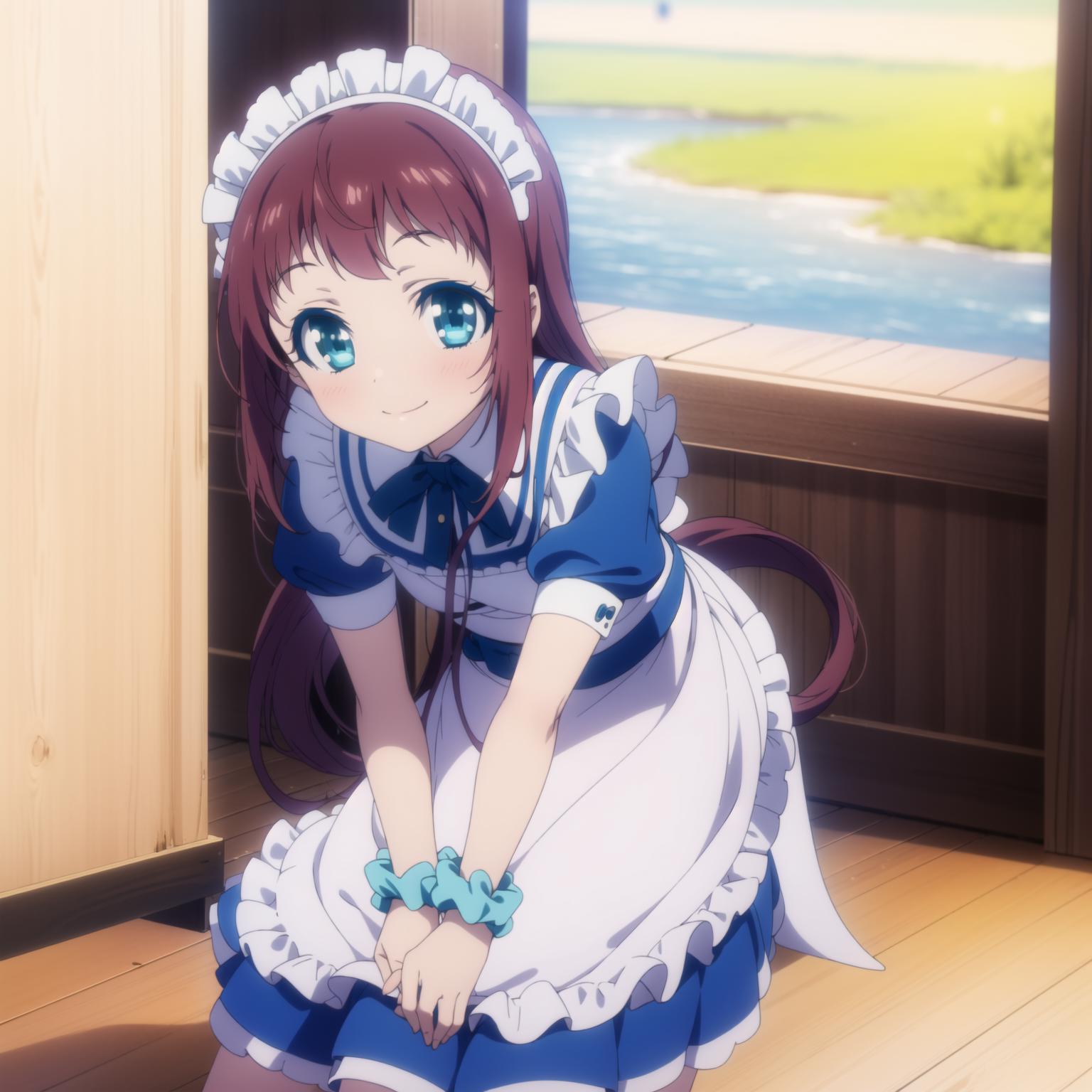 ,aamanaka,brown_hair,long_hair,blue_eyes,scrunchie,