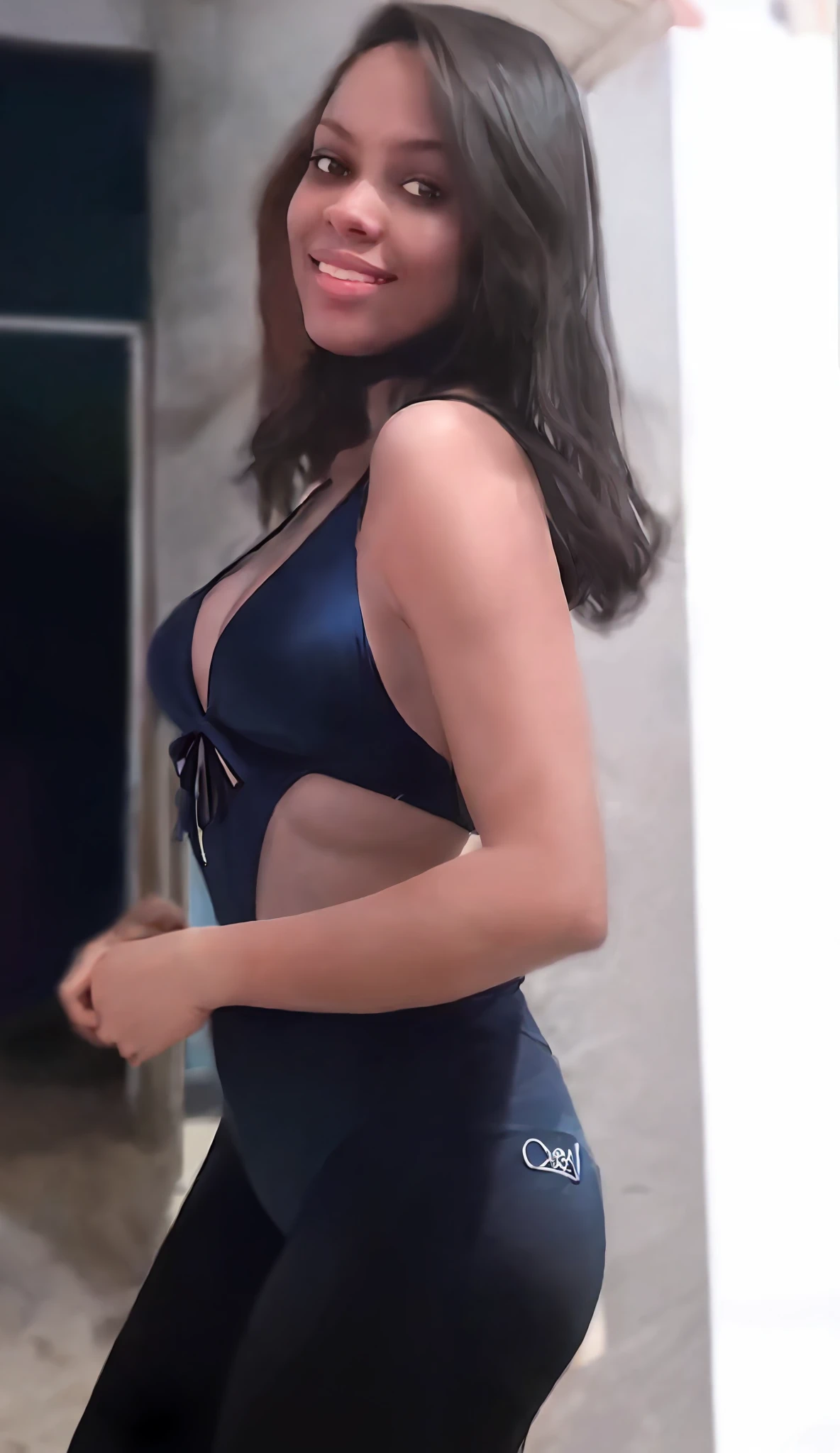 A close up of a woman in a blue ?????? top and black pants