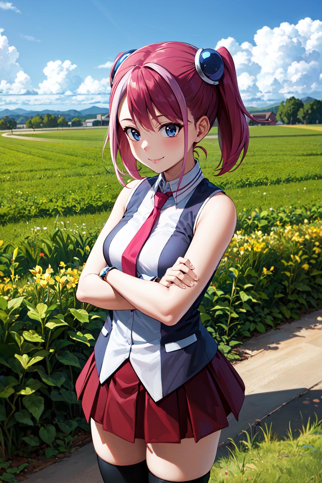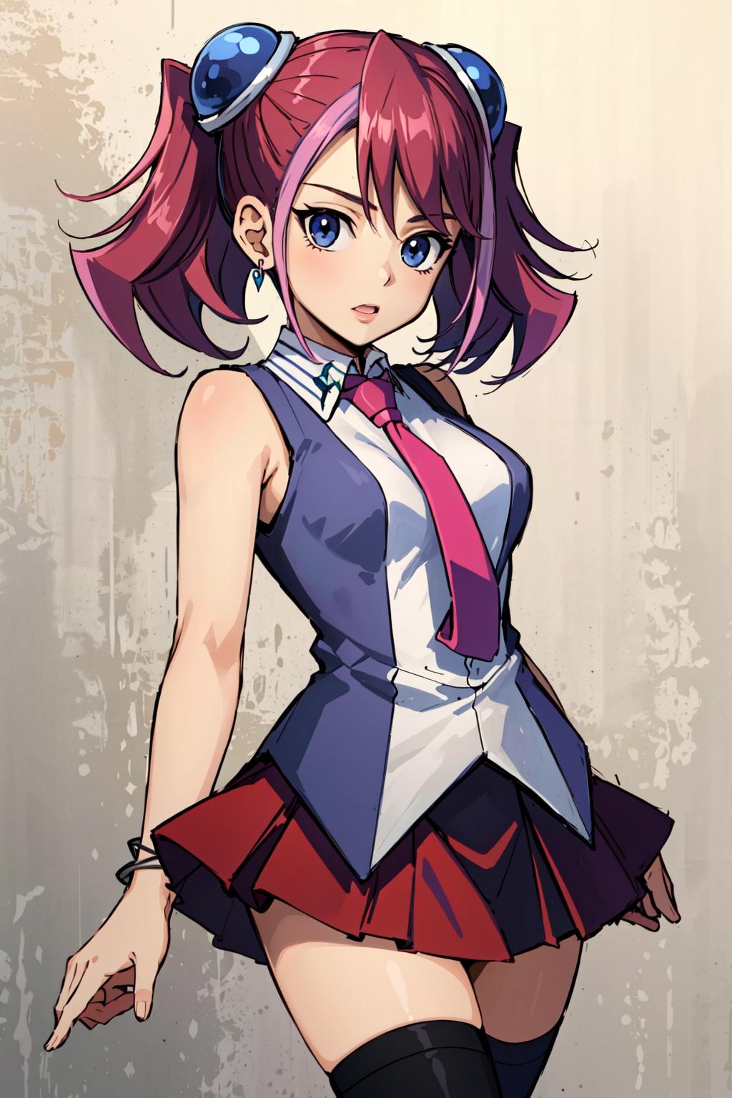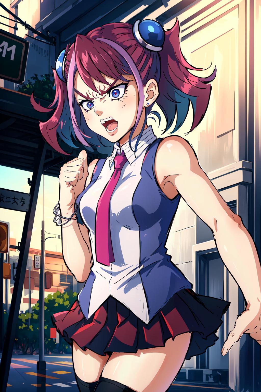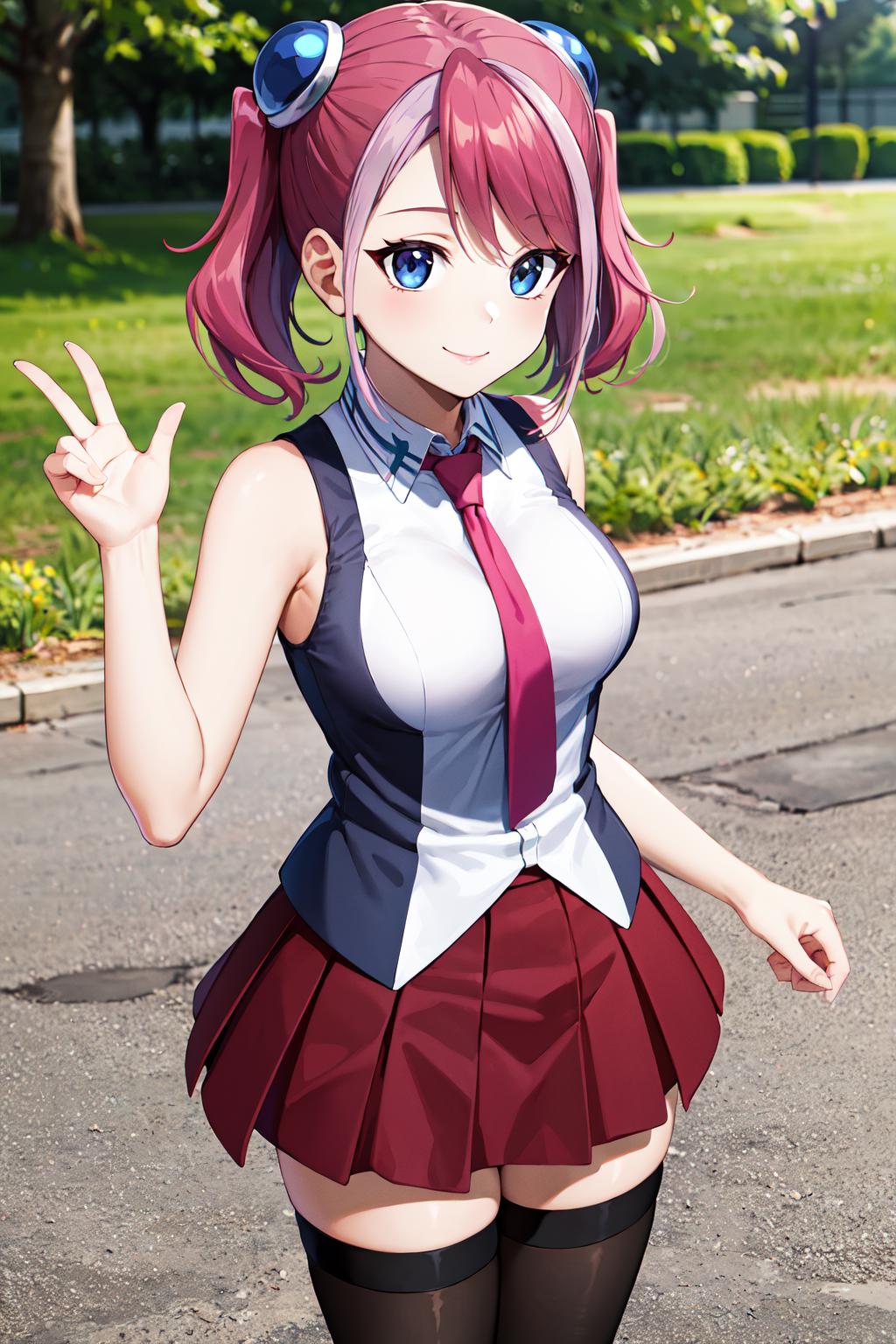 outfit1hy1, hair ornament, multicolored hair, necktie, skirt, sleeveless, school uniform, black thighhighs, jewelry