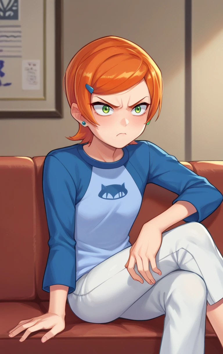GwenSDXL,1girl,short hair,shirt,hair ornament,long sleeves,jewelry,green eyes,earrings,hairclip,pants,orange hair,swept bangs,raglan sleeves