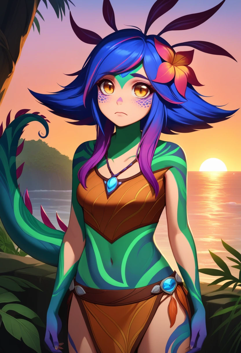 Trigger word is "neeko" and "multicolored hair, colored skin, facial mark, forehead mark, hair ornament" are required.