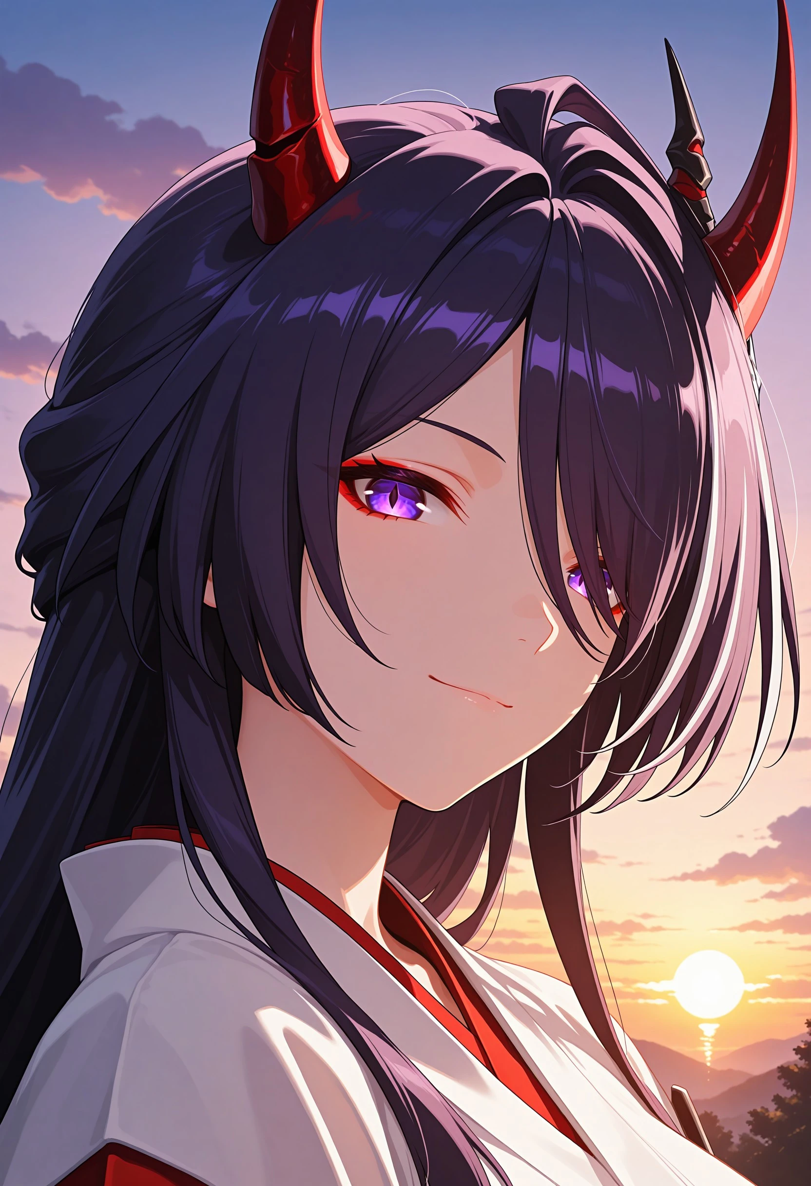 acheron, purple hair, purple eyes, hair over one eye, long hair, medium breasts